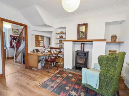 A lovely room with bay window to front with secondary glazing inside framing lovely views over Camelford town and Bodmin Moor in the distance, radiator, feature woodburning stove with overmantel, shelving to side, T.V. point, picture rails.