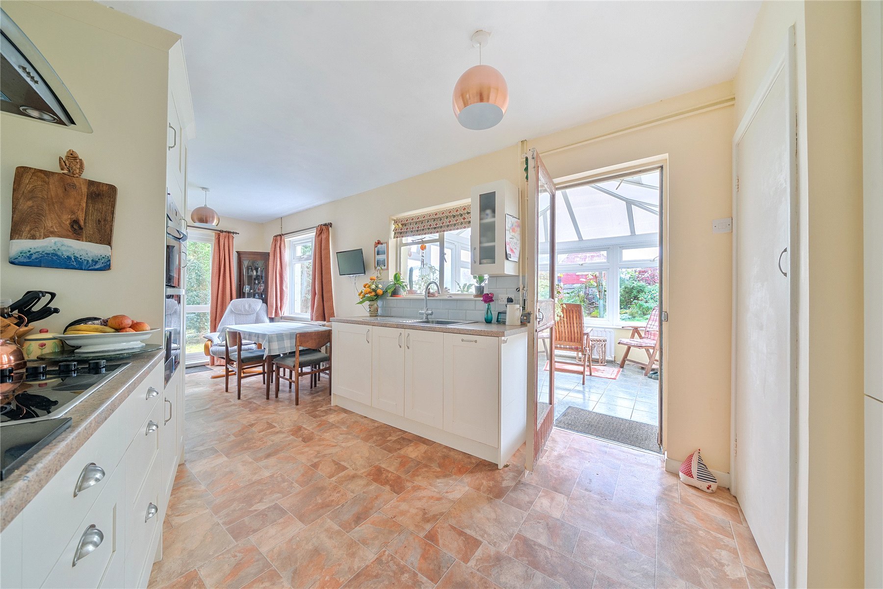 The kitchen and dining room offer a well-planned space for everyday living. A stainless steel sink with drainer and mixer tap is set into work surfaces with cupboards and deep drawers beneath. Additional worktops provide further storage, and a large pantry cupboard houses the gas boiler. Integrated appliances include a fridge freezer and double oven, a dishwasher, while the electric hob is set beneath an extractor canopy with a tiled surround. Two windows and a double-glazed door provide views and access to the garden. A connecting door leads to the hallway, while a glass door opens into the conservatory.