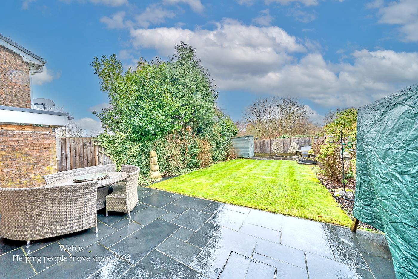 Externally, the home continues to impress with an enclosed rear garden, offering a private outdoor space complete with a patio seating area, ideal for outdoor dining and entertaining. To the front of the property, a large driveway provides ample off-road parking for several vehicles.