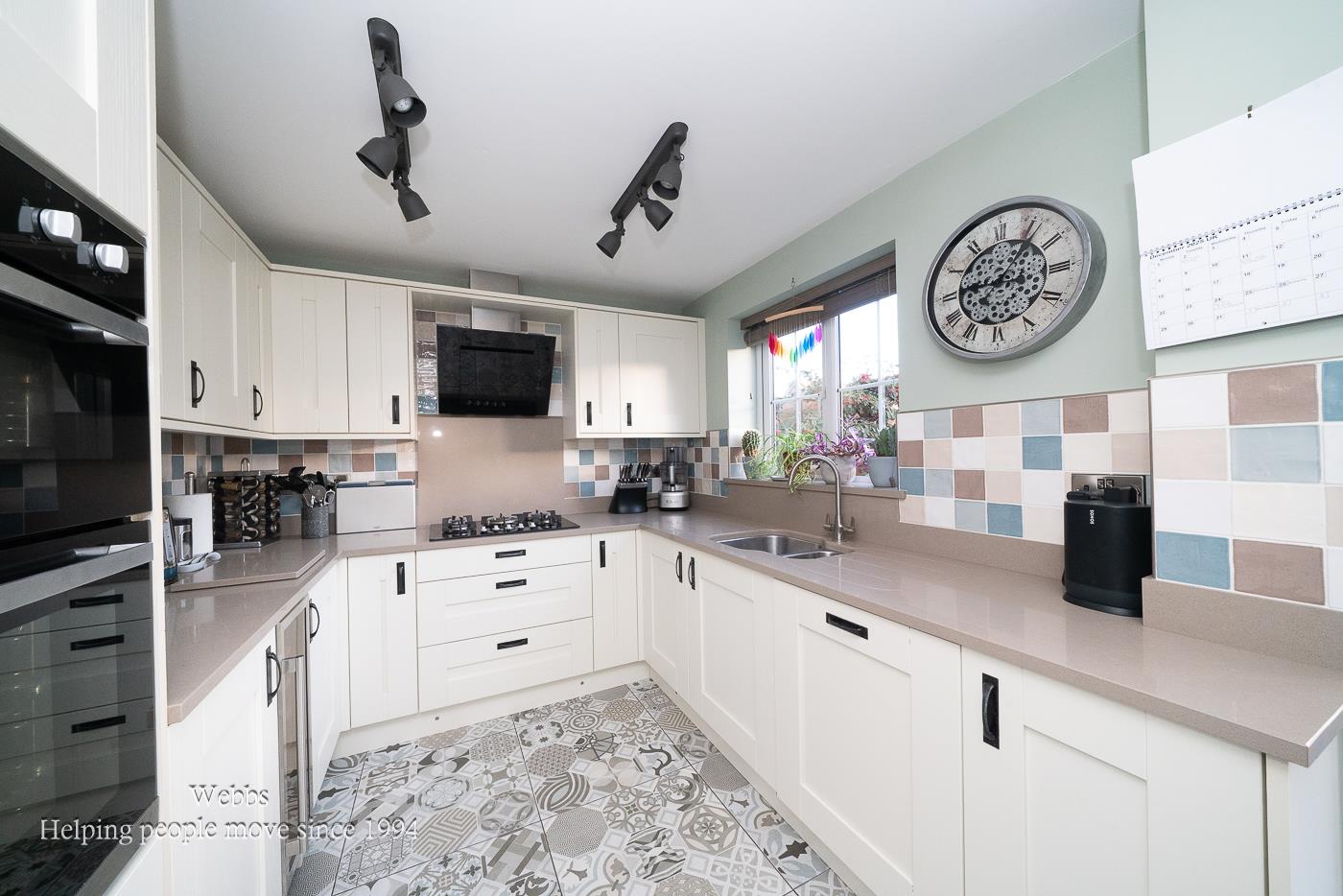 The heart of the home is undoubtedly the bespoke kitchen and dining area, which showcases exquisite Spanish tiles and high-quality Silestone worktops. The full-height glazed bay enhances the dining experience, providing a seamless connection to the outdoor space. The kitchen is thoughtfully designed with ample utility space, making it both functional and stylish.