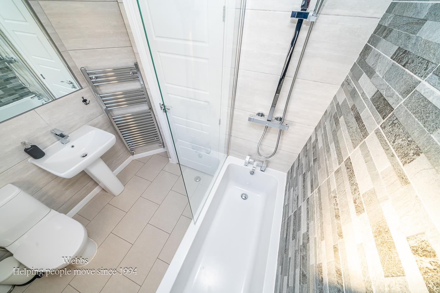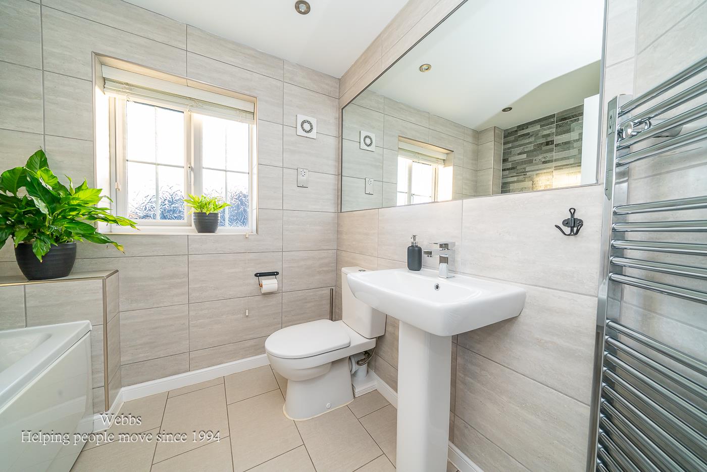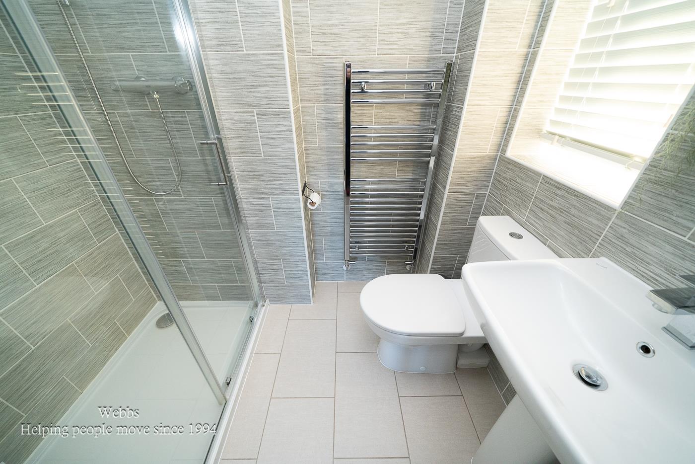 The bathrooms are equally impressive, featuring full-height tiling and elegant sheet mirrors, ensuring a touch of luxury in your daily routine. Bedrooms one, two, and three come equipped with fitted wardrobes, providing plenty of storage while maintaining a clean and tidy aesthetic. Throughout the home, 'perfect-fit' blinds offer privacy and style.