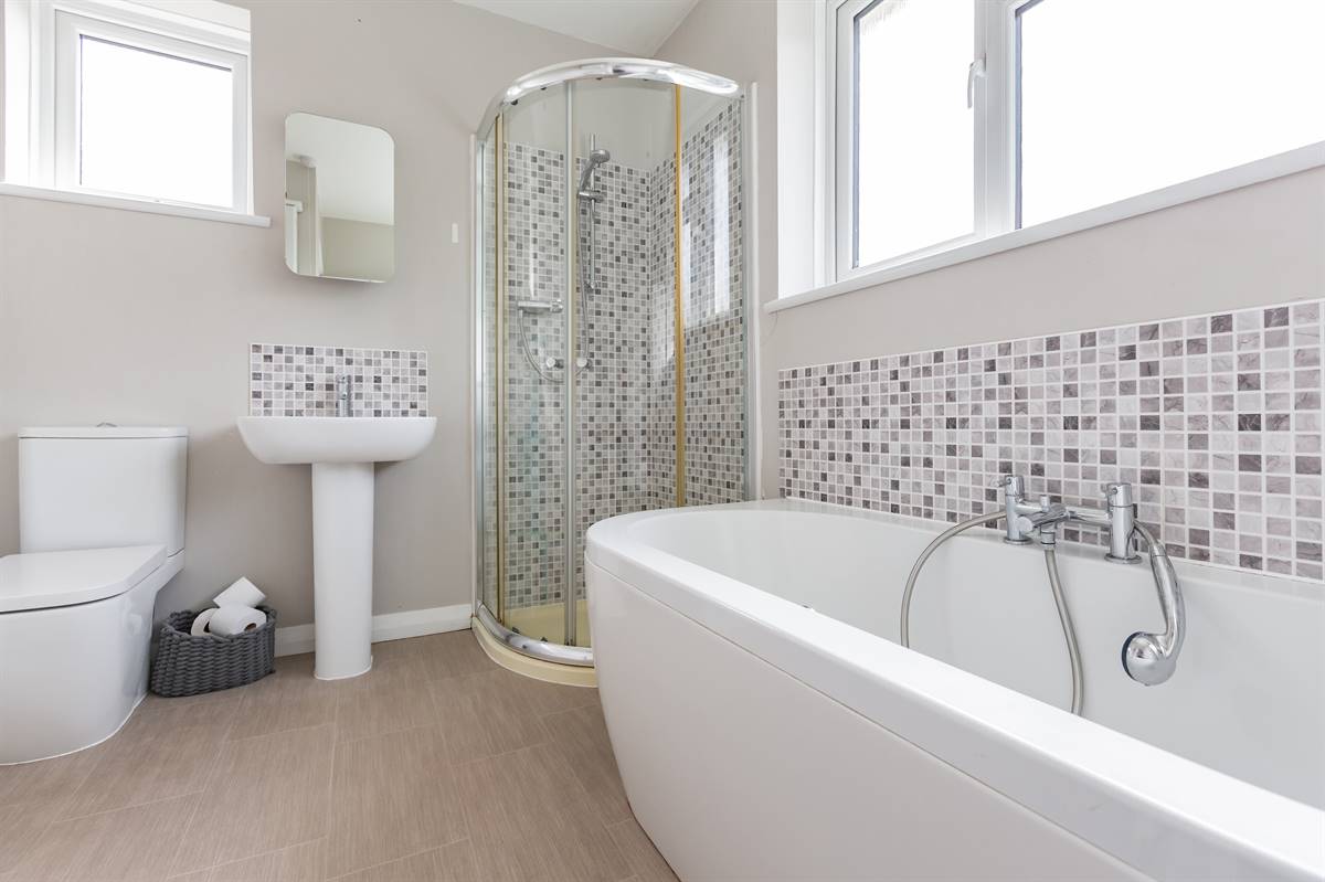 Suite in white comprising fully tiled shower cubicle, pedestal wash hand basin and close coupled WC. Chrome heated towel rail. Window to rear. Tiled flooring. Extractor fan.