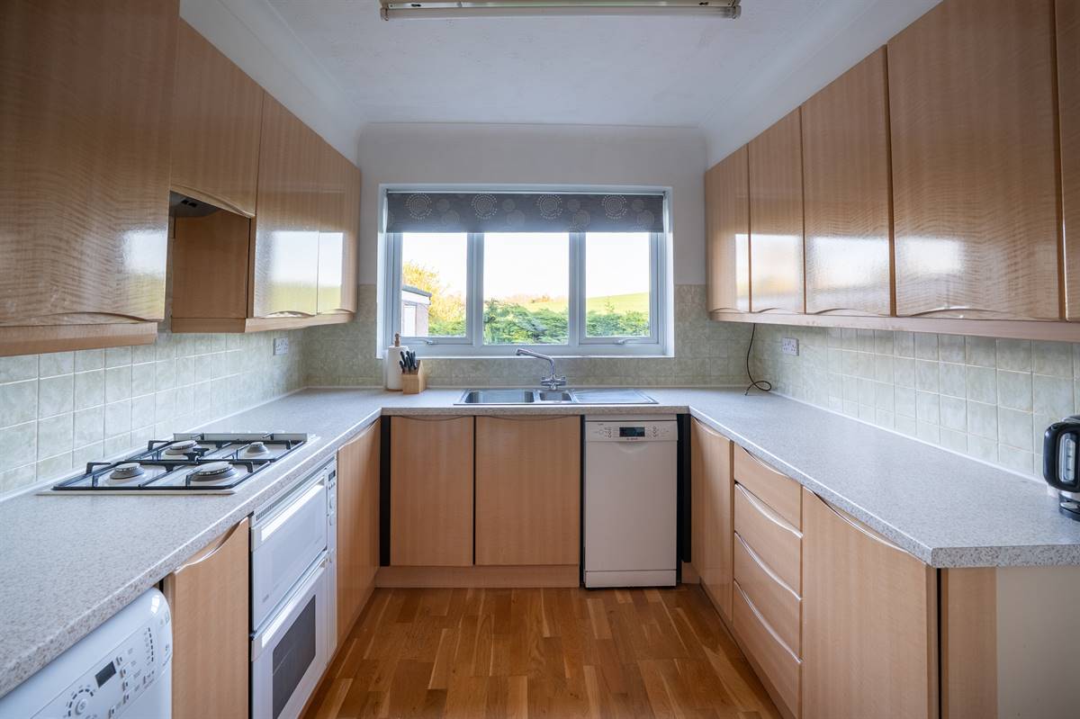 The kitchen is planned with a matching range of wall and base units arranged on three walls. Inset stainless steel 1.5 bowl sink unit. Partially tiled walls. Inset gas hob with extractor cooker hood above and built-in fan assisted electric oven below. Plumbing for washing machine and dishwasher. Wall mounted combination gas boiler supplying hot water and central heating. Windows to side and rear. Radiator. Wood flooring. Door to side.