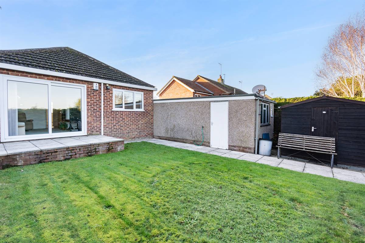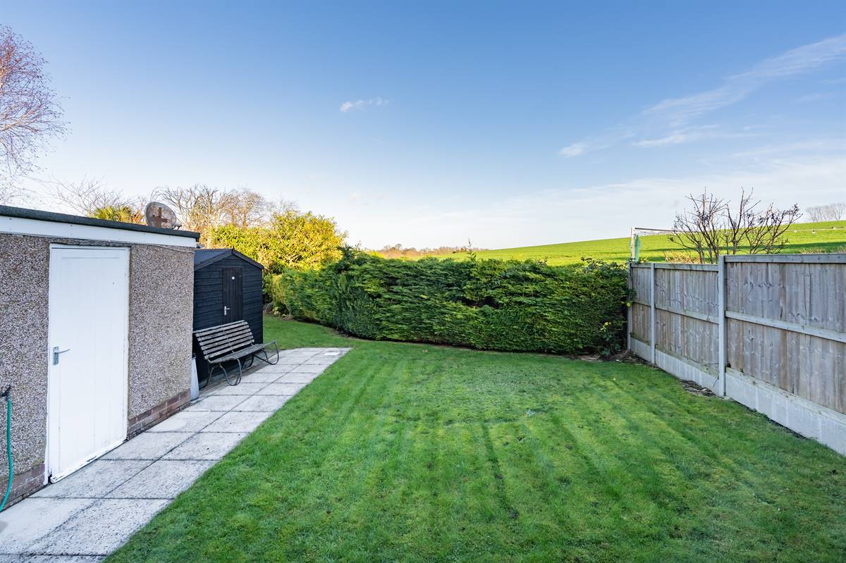 Mainly laid to lawn with hedging. Paved patio area. Timber shed. Enclosed with fencing and hedging.