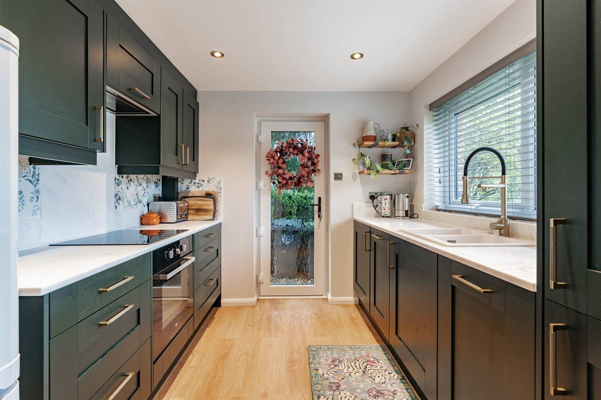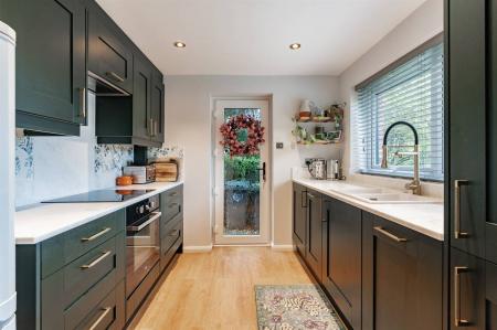 The kitchen is planned with a matching range of wall and base units arranged on two walls. Inset ceramic 1.5 bowl sink unit with integrated waste disposal attached. Inset induction hob with extractor cooker hood above and built-in fan assisted electric oven below. Integrated dishwasher and washing machine. Wall mounted combination gas boiler supplying hot water and central heating. Window to front. Laminate flooring. Door to side.