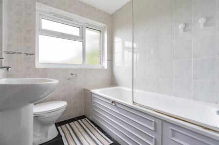 Suite in white comprising panelled bath with mixer tap and shower attachment, screen to side, pedestal wash hand basin and close coupled WC. Radiator. Tiled walls. Frosted window to front. Laminate flooring. Extractor fan.