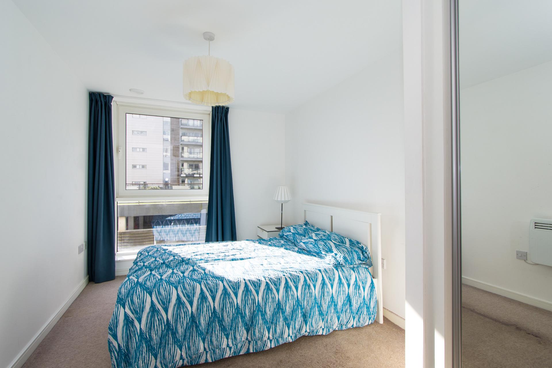 A double bedroom with water views and an en-suite shower room. Fitted carpet. Large double glazed window. Fitted wardrobe with mirrored sliding doors. Power points and TV point. Wall mounted Dimplex electric heater. Door to the en-suite.