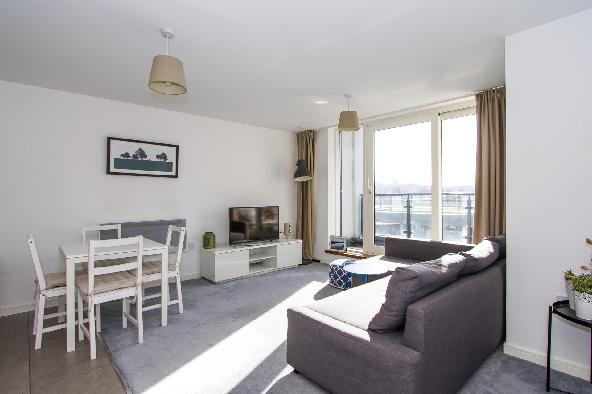 Part of an open plan living space with kitchen, this areas has a large double glazed window and sliding doors out onto the balcony, which offers water views. Fitted carpet. Power points and TV point. Wall mounted Dimplex electric heater. Open to the kitchen.