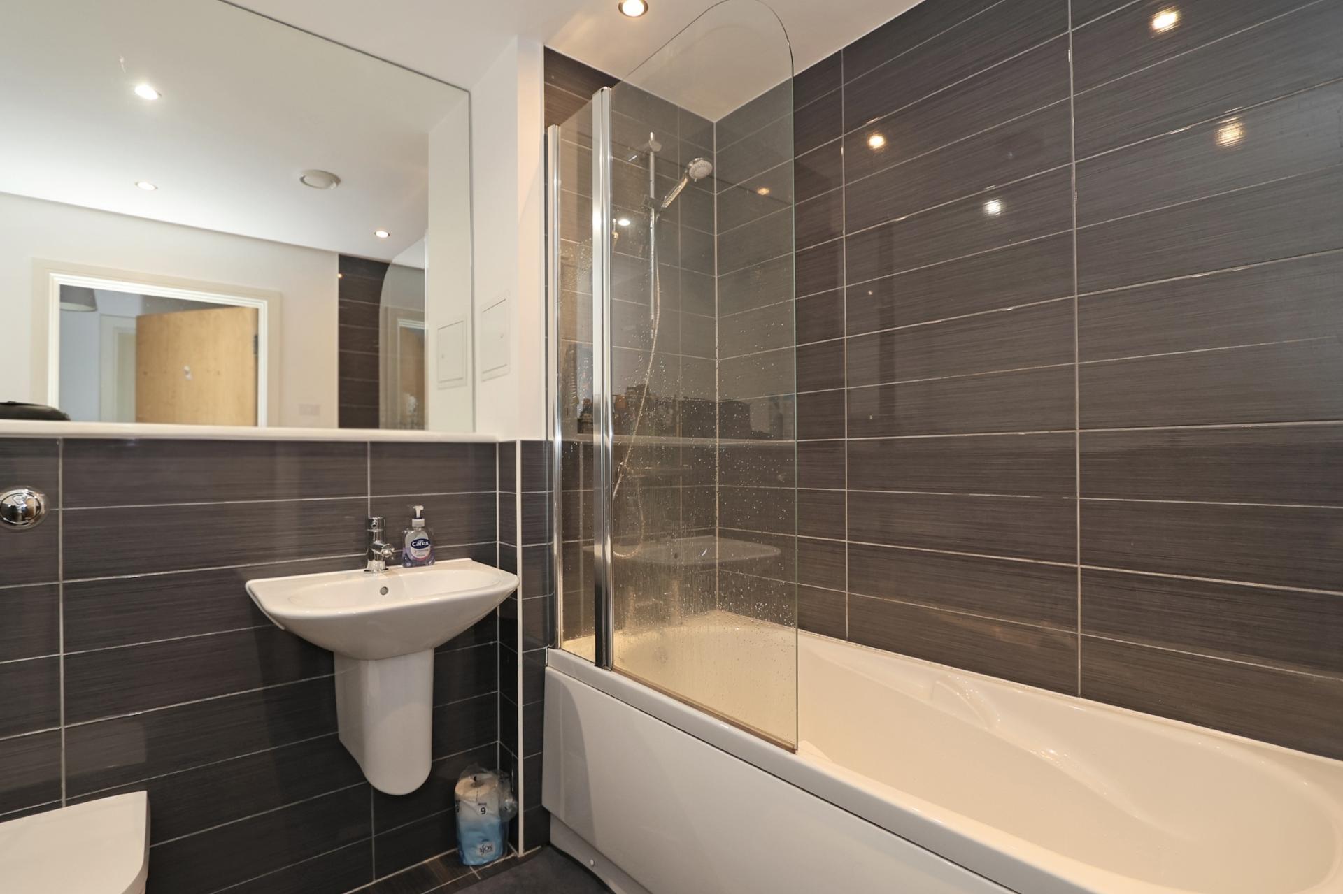 Tiled floor and part tiled walls. Suite comprising a panelled bath with mixer shower and glass screen, a WC and a sink. Fitted mirror. Heated towel rail. Recessed lights and extractor fan.