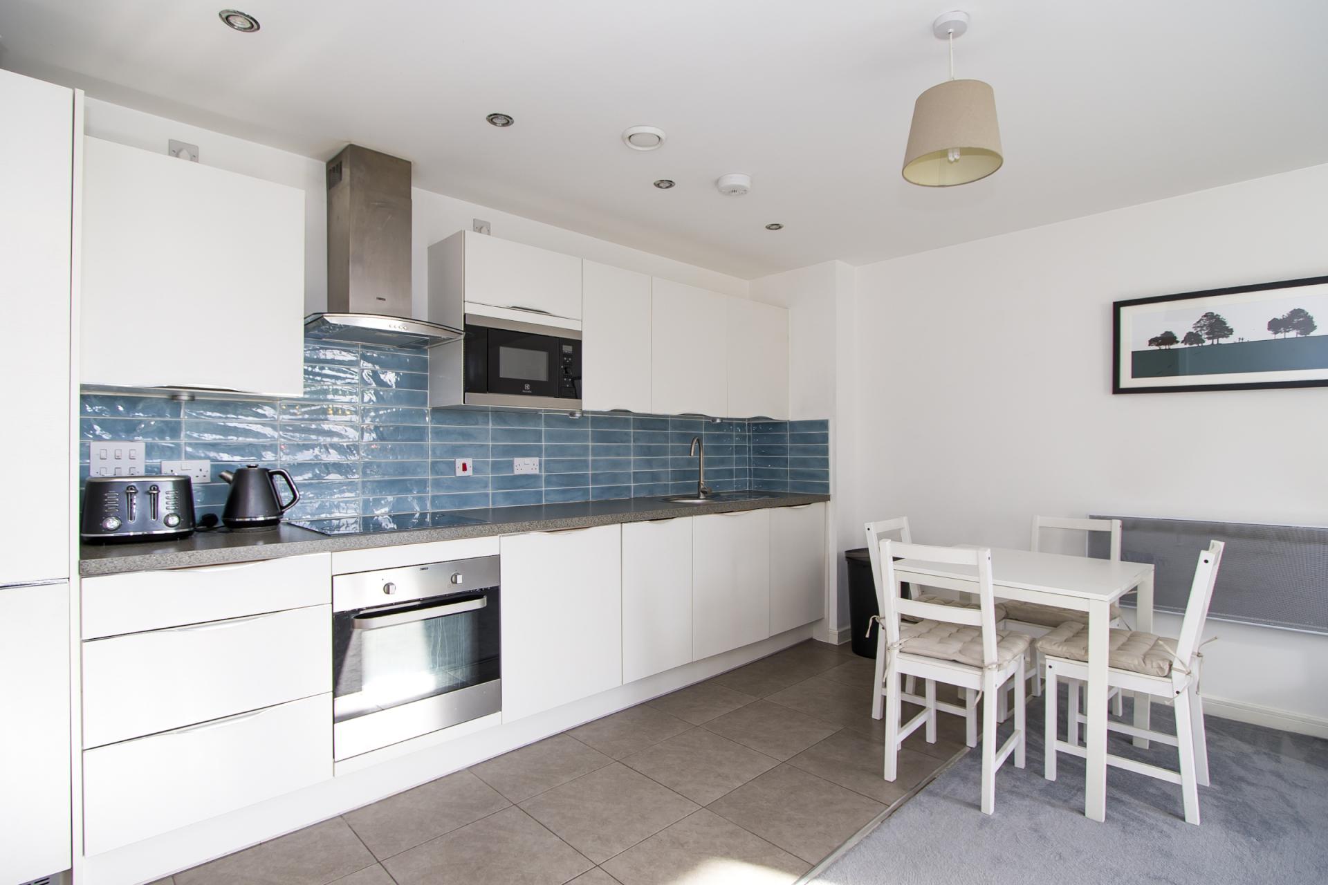 A fitted kitchen comprising wall units and base units with stone effect laminate work surfaces. Integrated appliances including an electric oven, four zone electric hob, microwave, extractor hood, fridge freezer, a dishwasher and a washing machine. Single bowl stainless steel sink with drainer. Tiled floor. Tiled splashbacks. Recessed lights and extractor fan. Power points