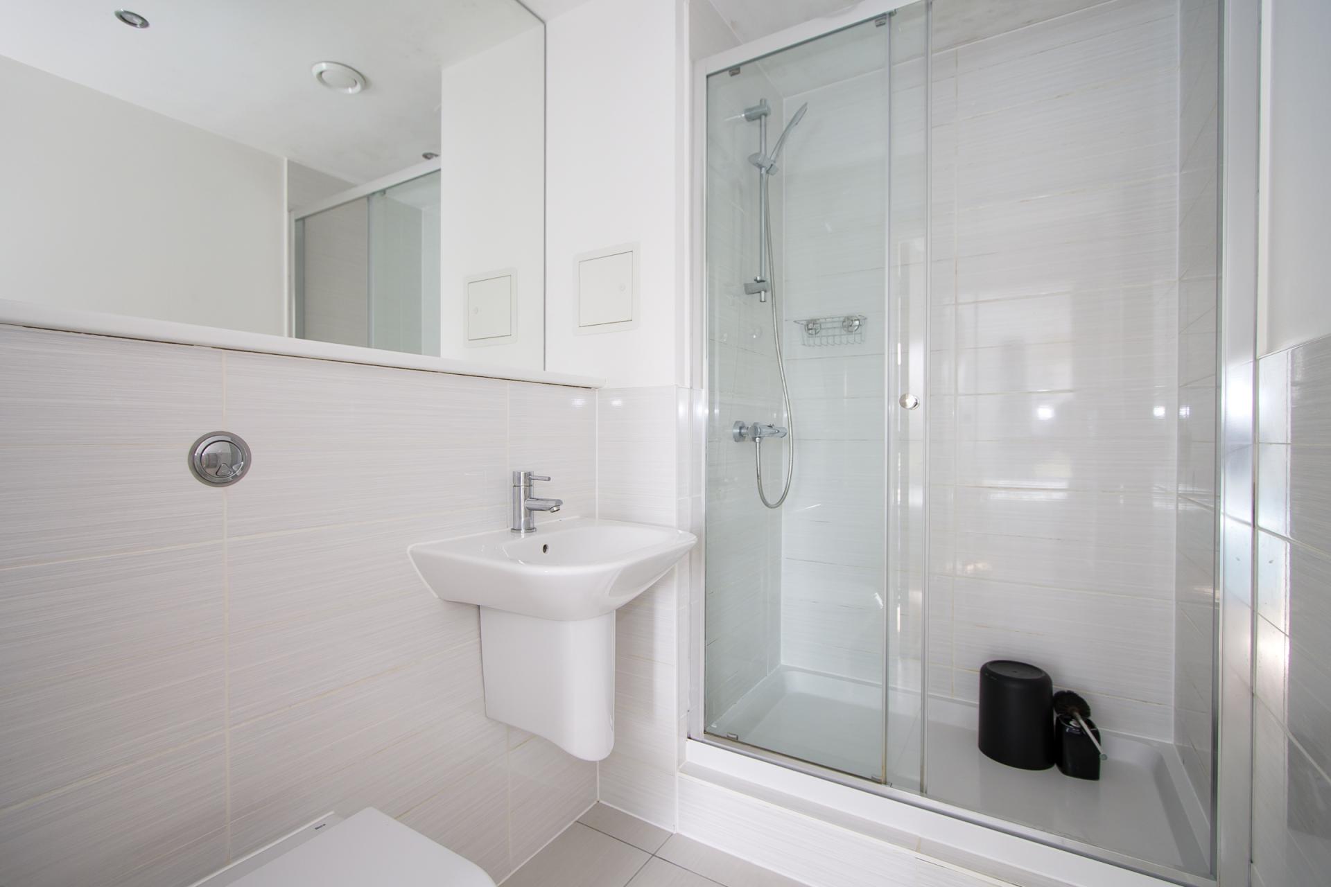 A well-proportioned shower room with tiled floor and part tiled walls. Suite comprising a shower cubicle with mixer shower, a WC and a sink. Fitted mirror. Heated towel rail. Recessed lights and extractor fan.