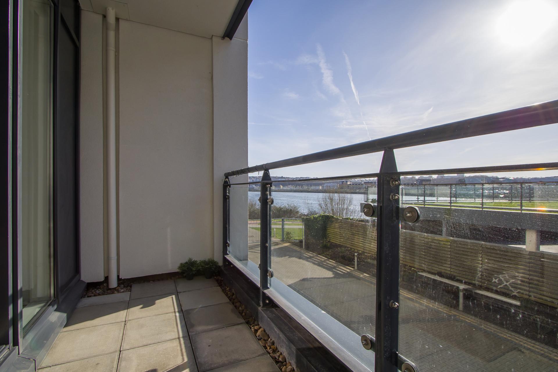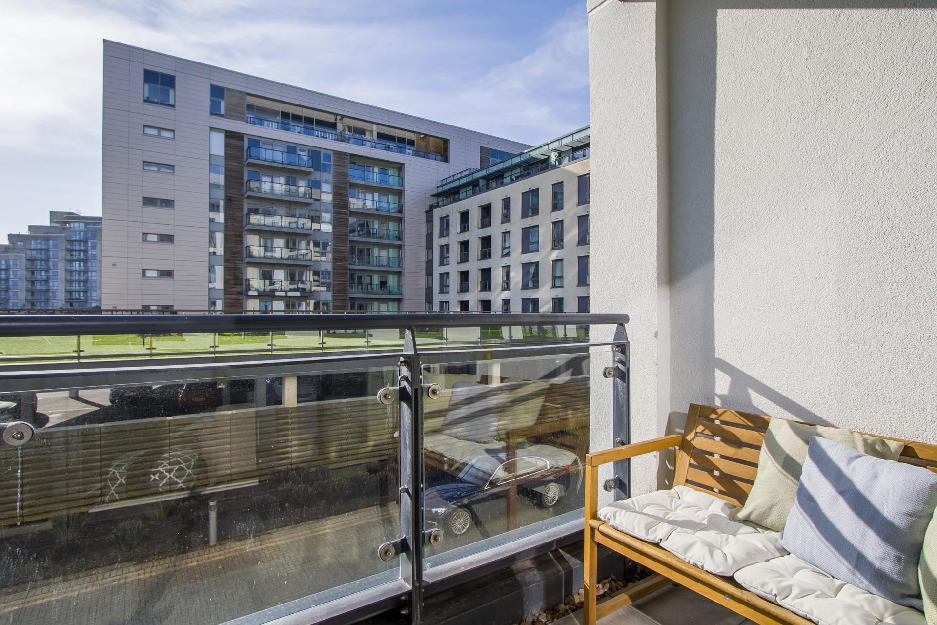The property benefits from a balcony laid to stone paving, with water views and space for chairs. Glass and painted steel balustrade. This balcony has a southerly aspect and overlooks communal gardens as well as the water.