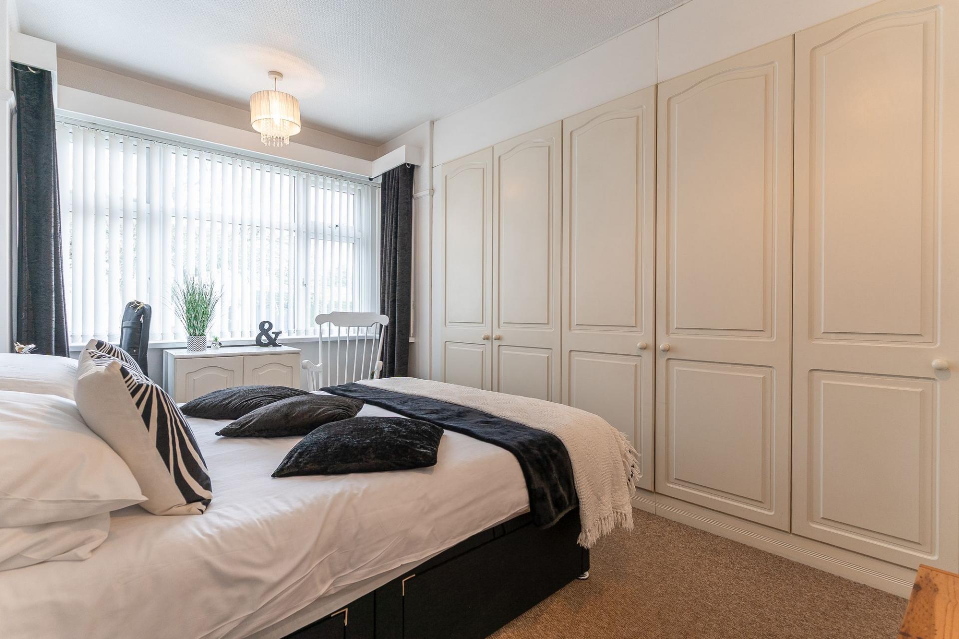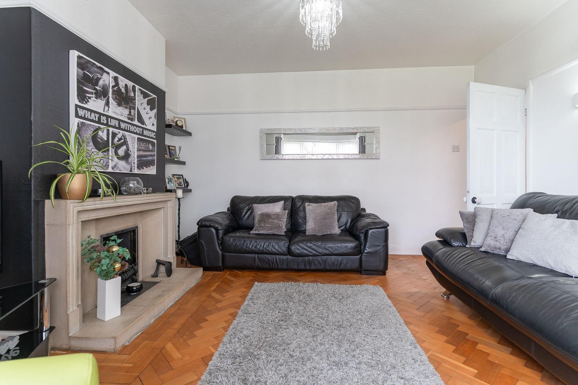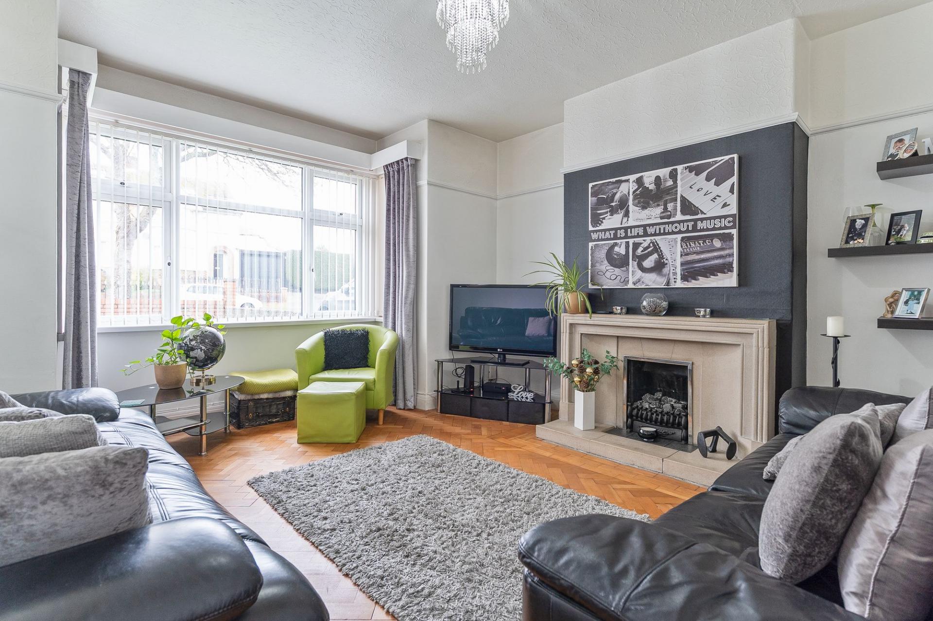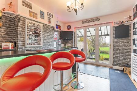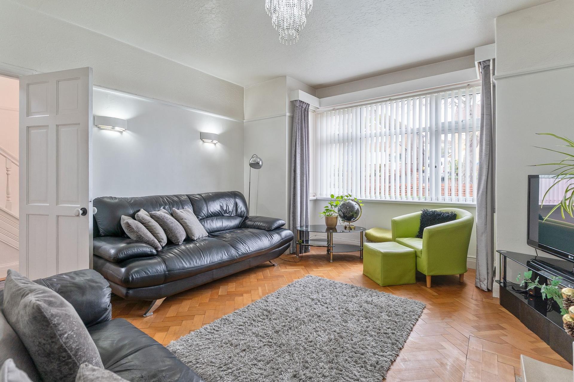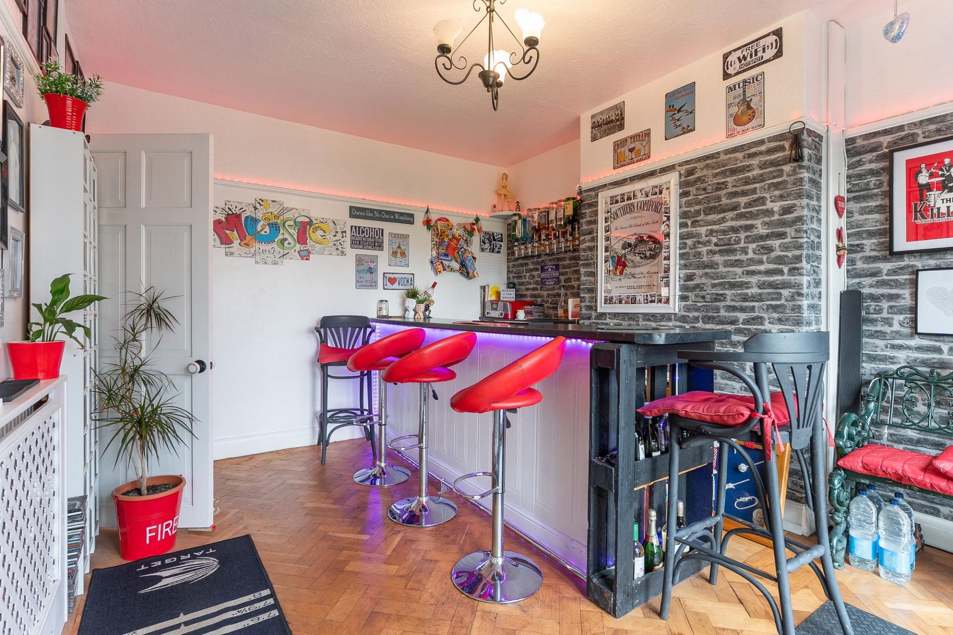 You enter the property through a welcoming hallway, which provides access to the main living areas and stairs leading to the first floor. To the left is the living room, a bright and inviting space with tall ceilings and a large bay-fronted window that fills the room with natural light. The décor is tasteful and neutral, creating a comfortable environment for relaxing or entertaining. Adjacent to the living room is the dining room, currently set up as a stylish home bar, offering a versatile space that could easily be used for formal dining, a home office, or a playroom depending on personal needs. Completing the ground floor is the kitchen/breakfast room, a generous and sociable space featuring a large fitted kitchen with ample unit and worktop space, alongside room for a breakfast table. This area is ideal for family living and provides a welcoming spot for everyday dining or entertaining guests.
