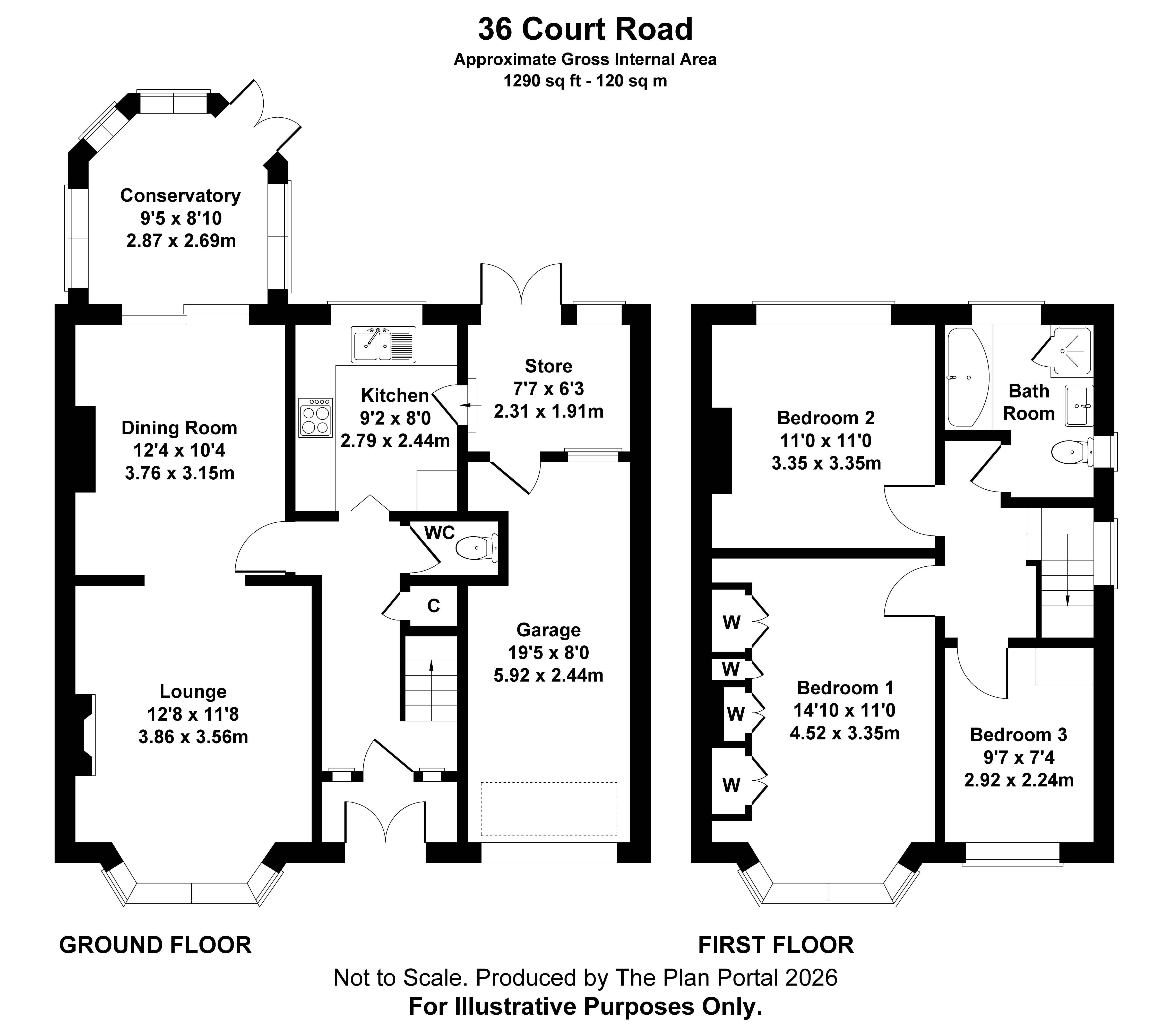 Conservatory 9'5" (2.87m) x 8'10" (2.69m) overall A pitched polycarbonate roof, full height windows and French doors opening onto the rear garden, ceramic floor tiling, power and lighting.