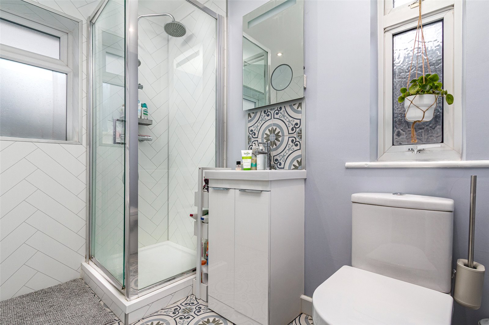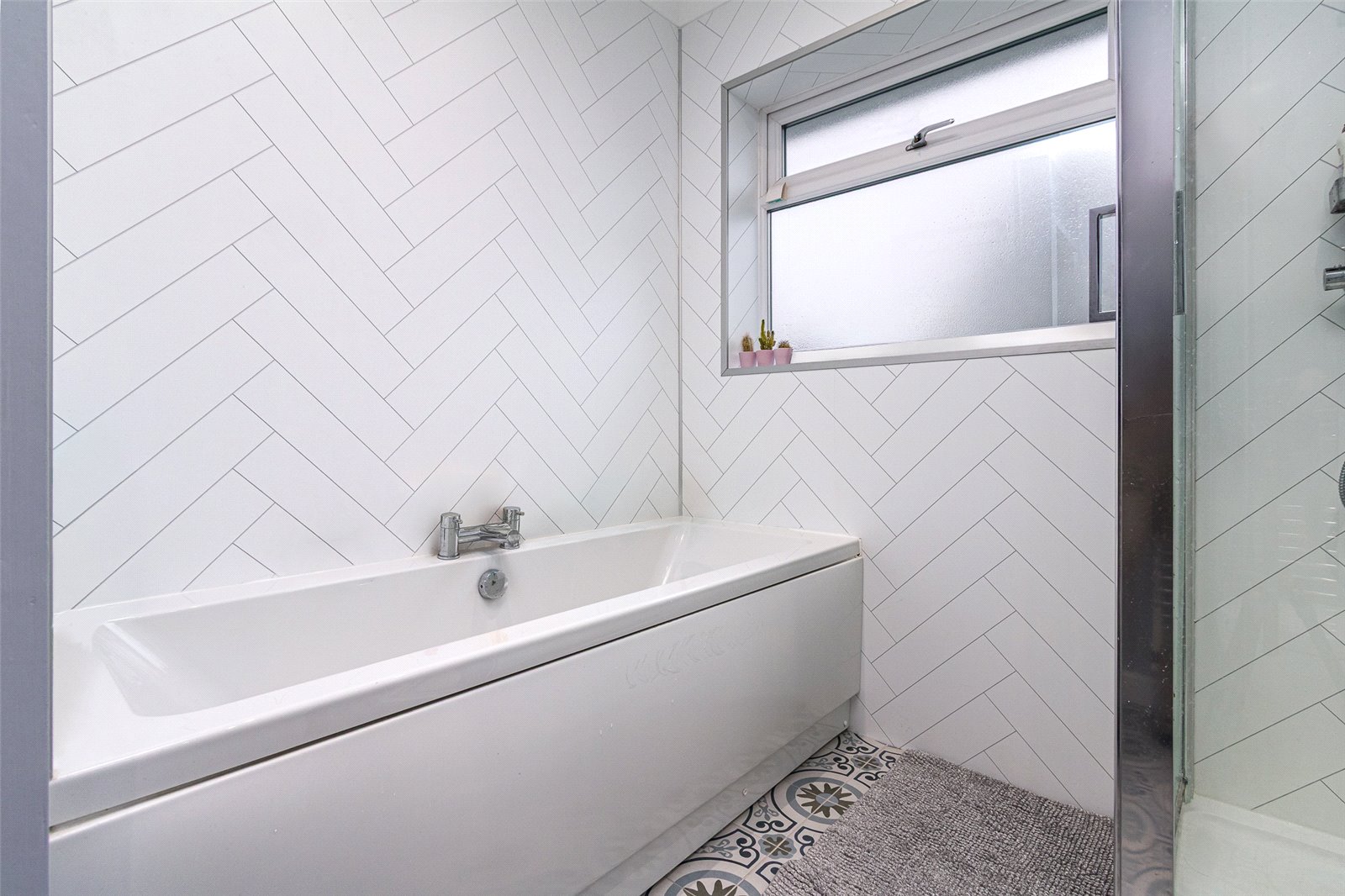 Bathroom A completely refurbished and reconfigured bathroom with opaque windows to the rear and to the side, modern white suite comprising of a panelled bath with central taps and tile effect wall panelling, a separate large shower cubicle with fixed rainfall style shower head with thermostatic controls and flexible handle, wall mounted ceramic wash hand basin with storage below and wall tiles above, feature vanity mirror with built-in light, shaver point and shaving magnifier, close coupled push button WC, ceramic floor tiling, heated chrome towel rail, ceiling spotlights.