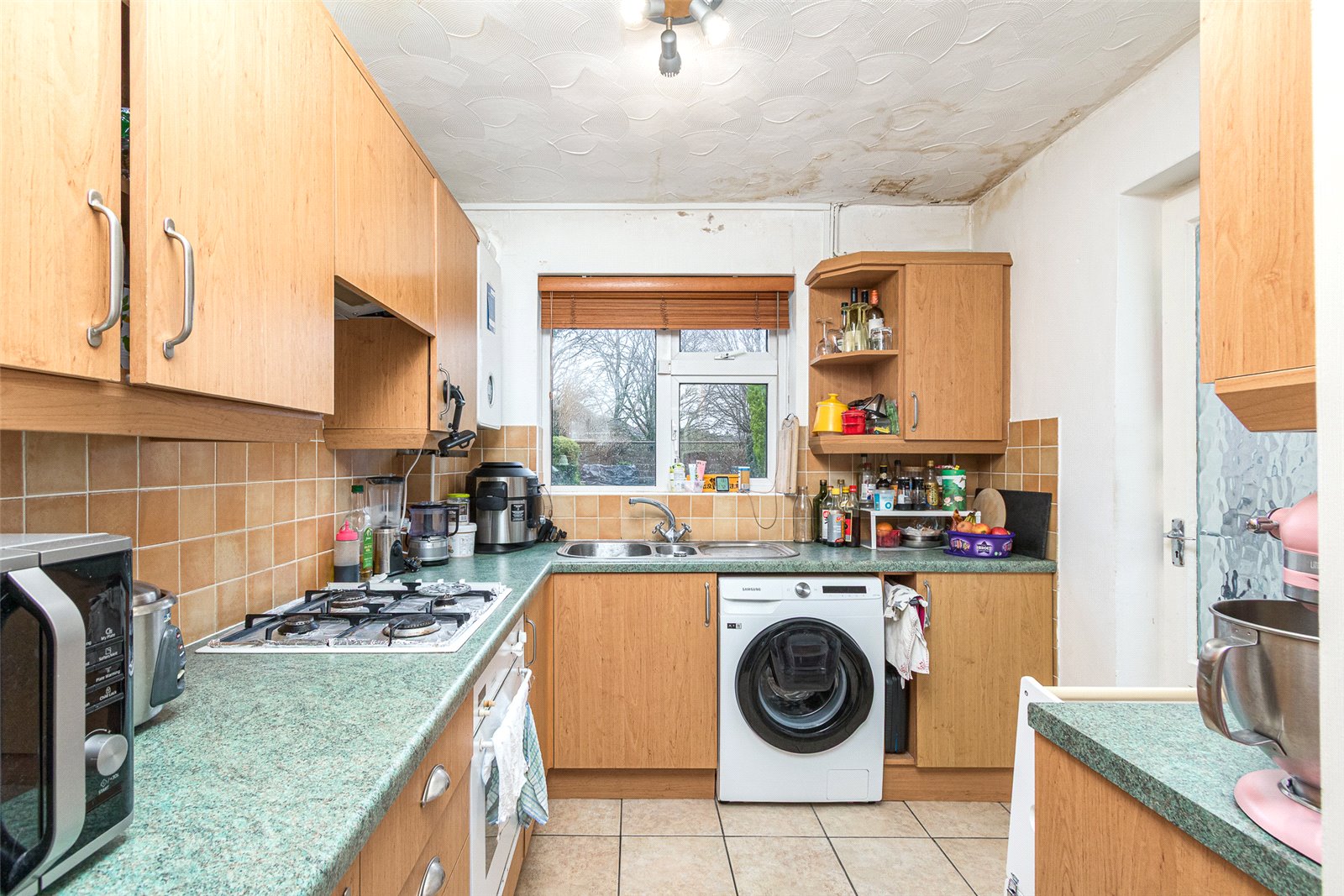 Kitchen 9'2" (2.79m) x 8'0" (2.44m) Overlooking the generous rear garden and open space beyond the boundary, kitchen is appointed along three sides comprising eye level units and base units with drawers and round nosed worktops over, ceramic wall tiling to work surface surrounds, inset 1.5 bowl sink with mixer tap and drainer, fitted four burner gas hob with cooker hood above and electric oven below, plumbing and space for washing machine, ceramic floor tiling, wall mounted Worcester gas central heating boiler, glazed door into the laundry/store room.