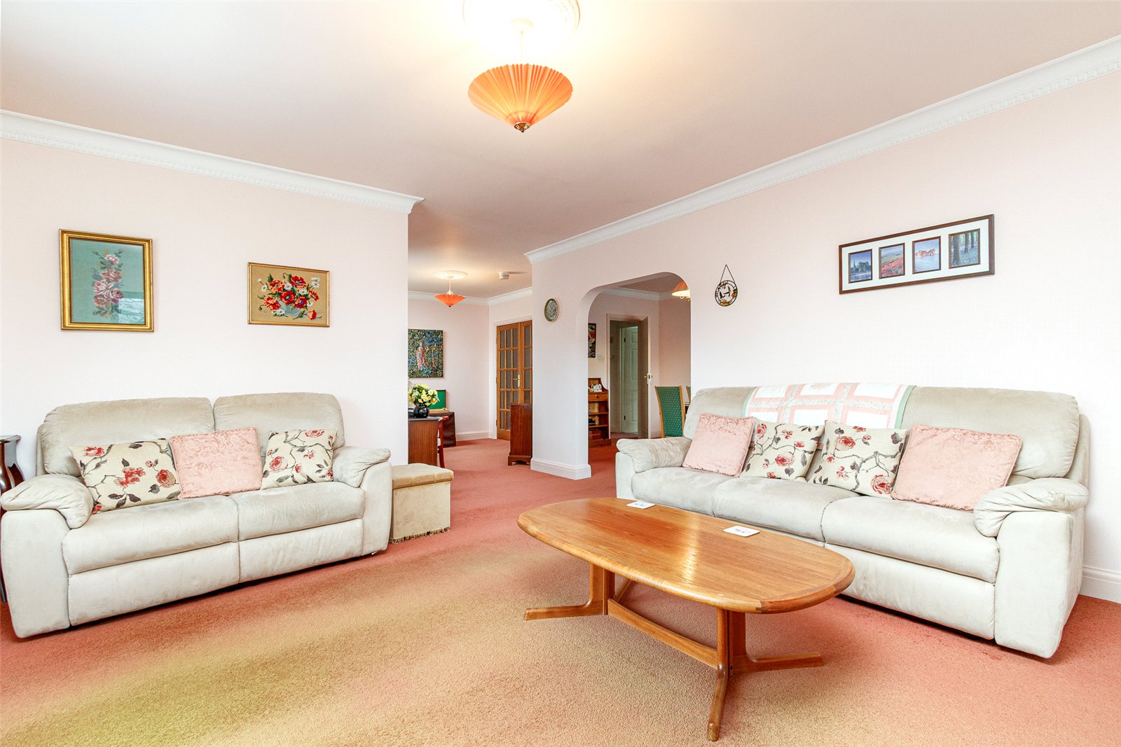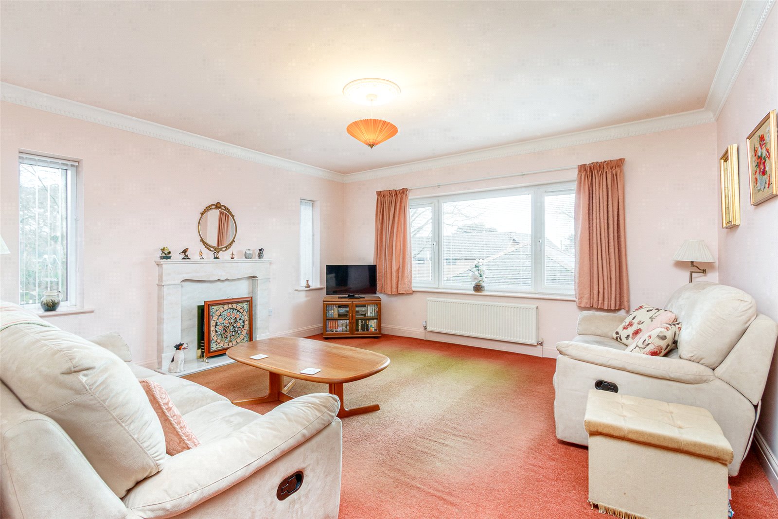 Lounge 148 x 147 Large room with windows to two elevations looking over the end of a quiet cul-de-sac, a feature fireplace (not tested) with a marble style surround and hearth, double radiator, TV point, coved ceiling a square arched opening into dining room and a walkway into the sitting room area.