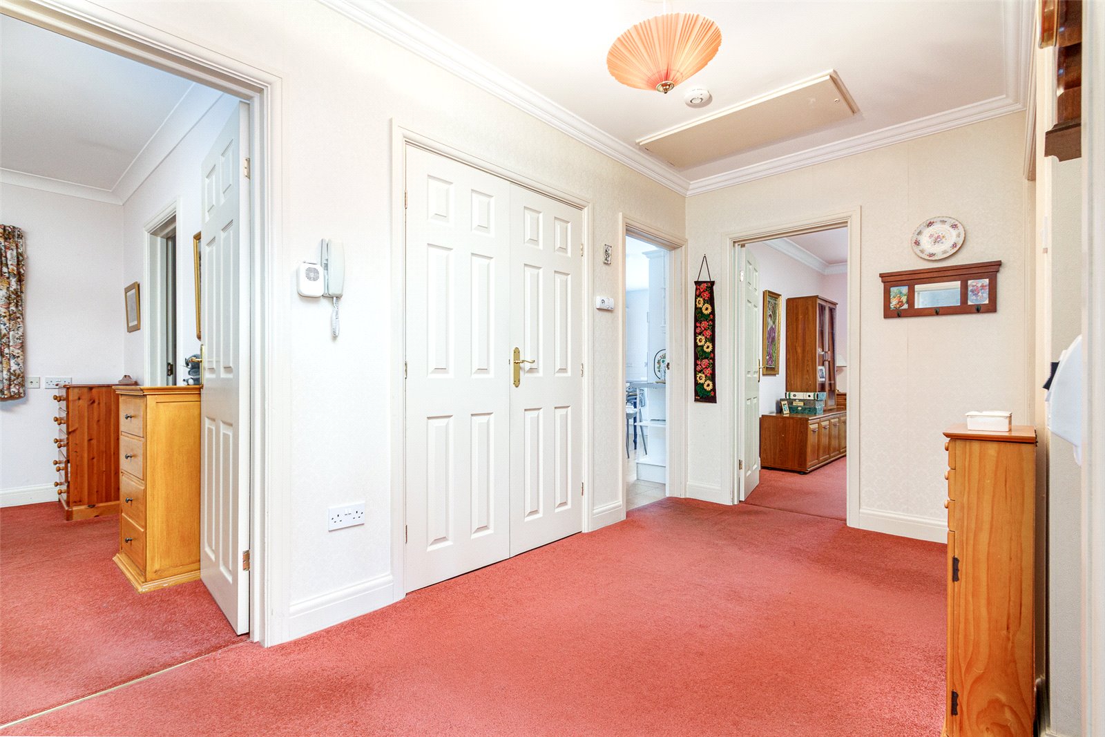 Large Central Hallway 136 x 68 Large loft access with fold down loft ladder, large private loft space, double radiator, telephone entry system, double cupboard with radiator and shelving, coved ceiling, door to the other accommodation.