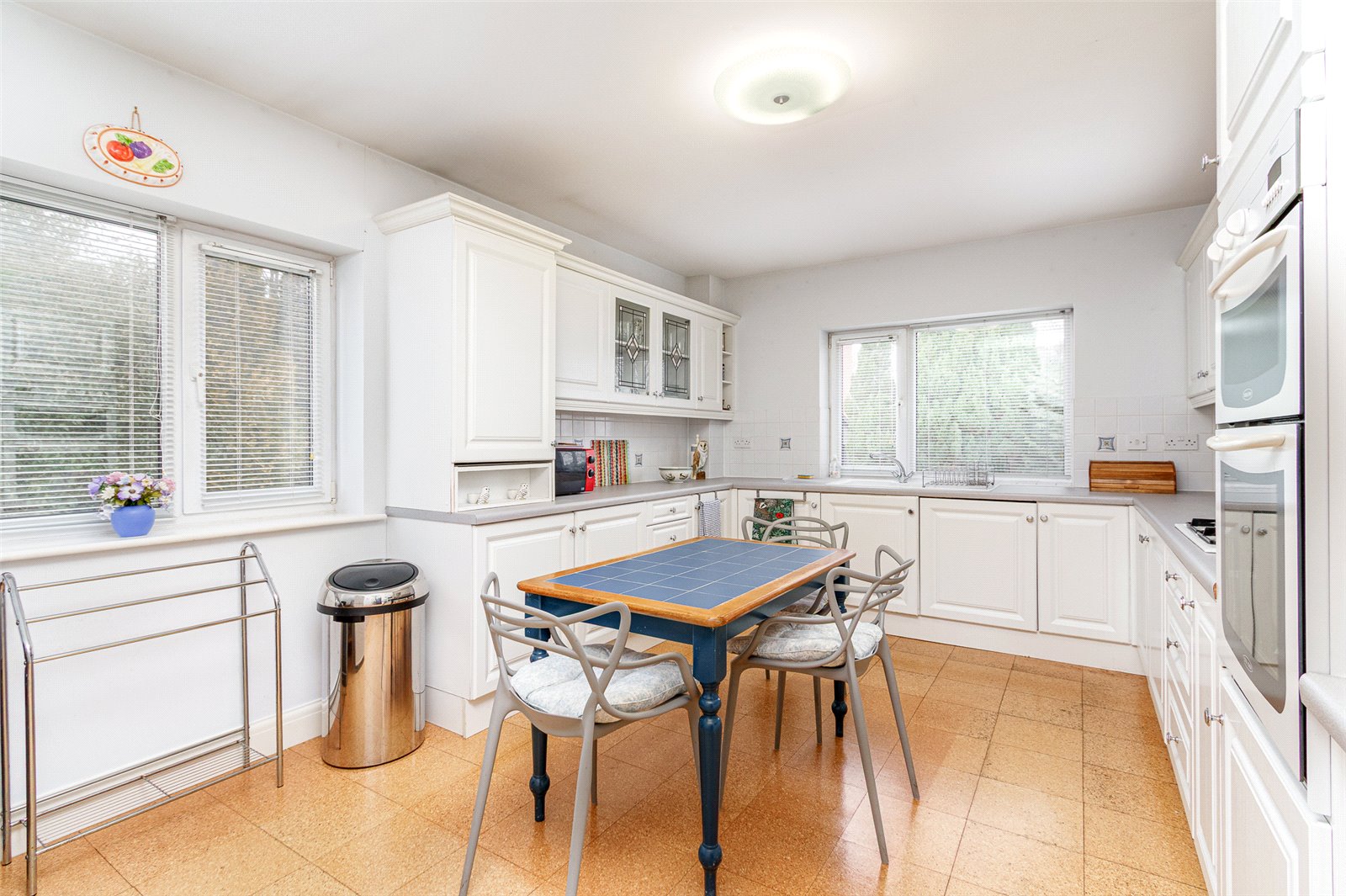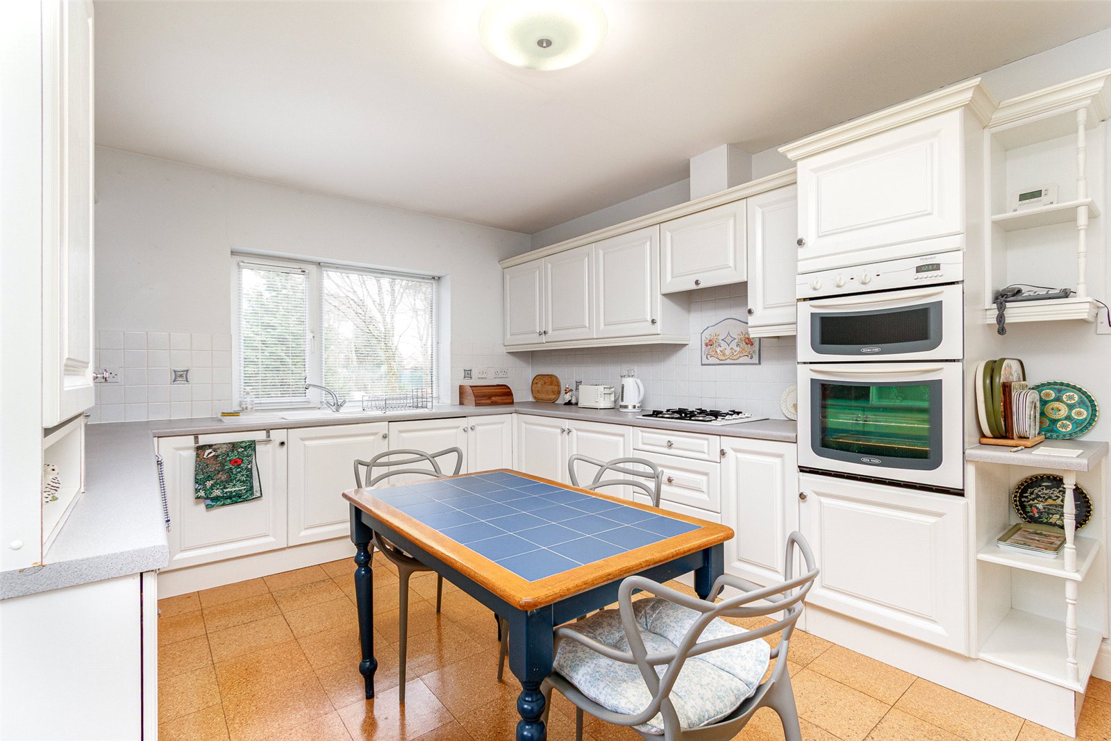 Kitchen/Breakfast Room 162 x 113 Aspect to two sides with excellent light, modern white fronted wood grain finished kitchen appointed along three sides comprising of eye level units, display units and base units with drawers and round nose worktops over, ceramic wall tiling to work surface surrounds, inset one and a half bowl sink with mixer tap, fitted four burner gas hob with cooker hood above and fitted double oven, integrated washing machine, integrated low level fridge and a separate freezer, ample space for breakfast table and chairs, radiator, cork style floor tiling, telephone point, wall mounted Worchester gas central heating boiler behind a matching wall unit.