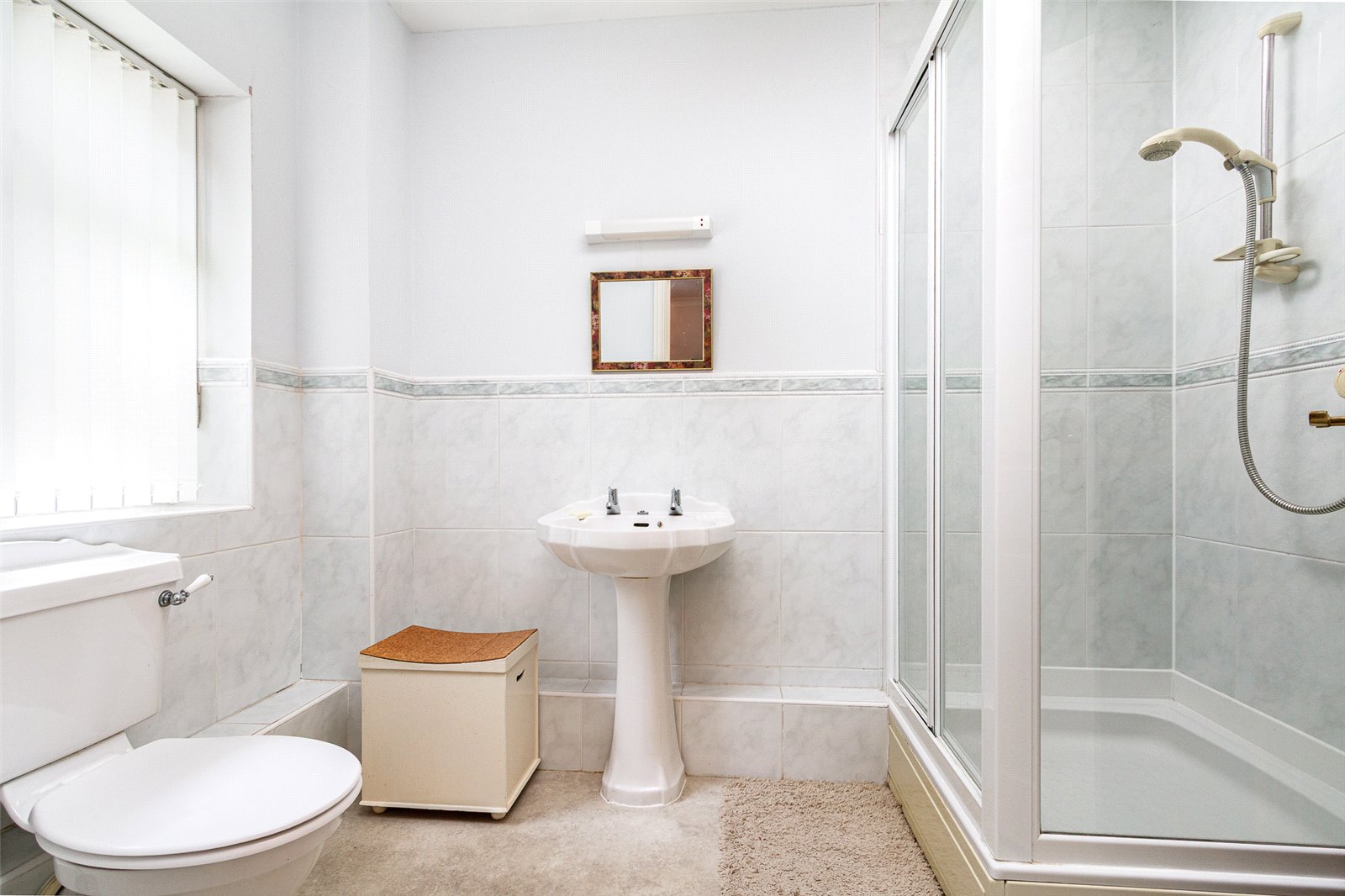 Ensuite Shower Room Opaque window to the rear, fitted suite comprising a large shower cubicle with Mira thermostatic controls and fully wall tiled, pedestal wash hand basin, close coupled WC, ceramic wall tiling to half height, cushion flooring, heated chrome towel rail, combination light and shaver point.