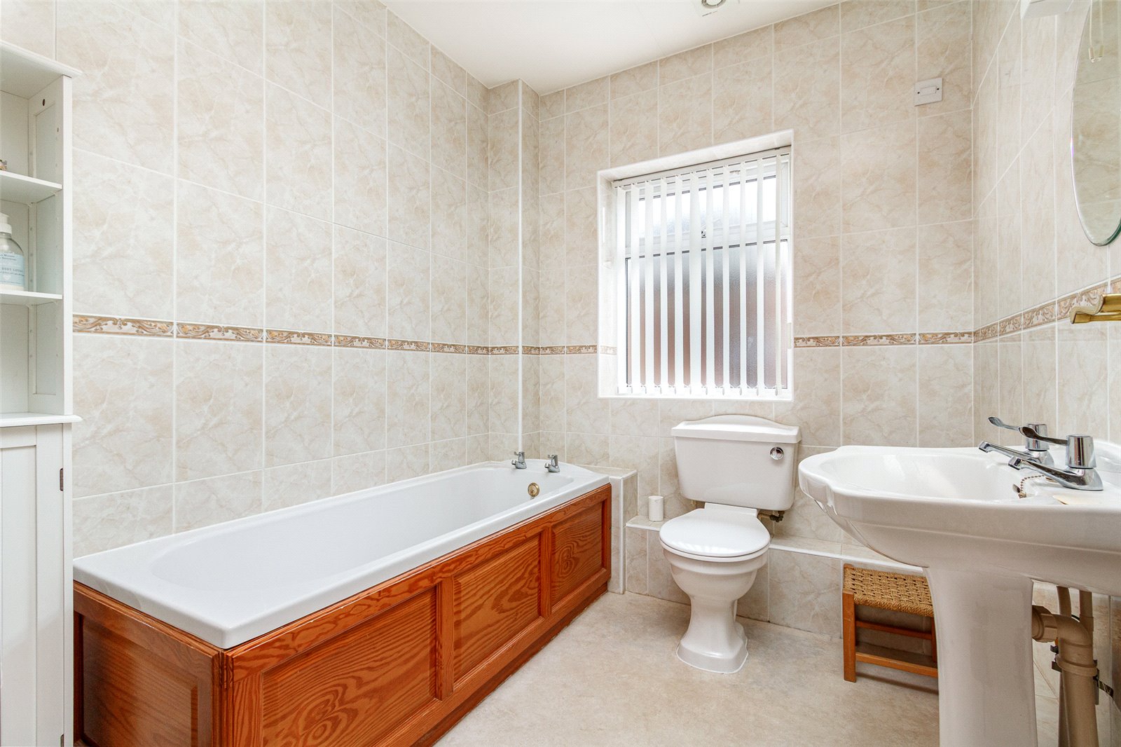 Bathroom Opaque window to the side. A white suite comprising of a panelled bath, close coupled push button WC, pedestal wash hand basin, comprehensive ceramic wall tiling, cushioned flooring, combination lighting, shaver point, heated chrome towel rail.