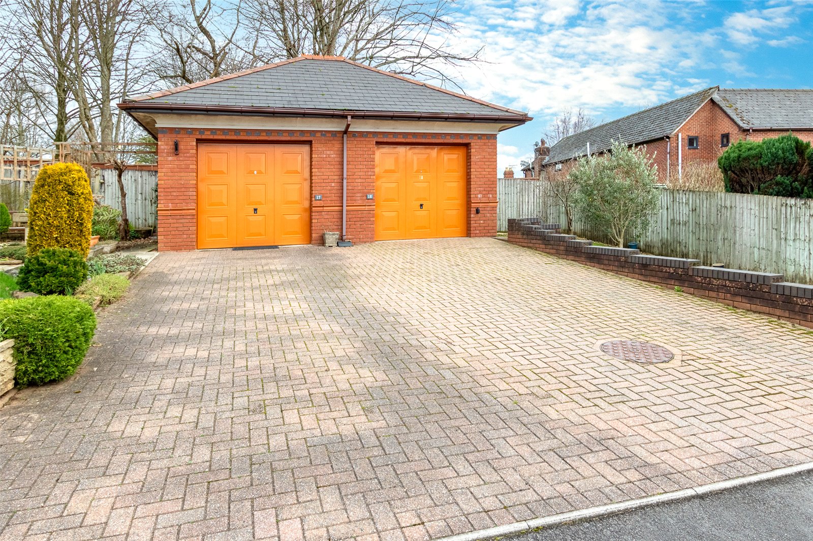 Outside A key block driveway leading to a garage attached to the neighbouring garage detached from the property with up and under door, path to the entrance door.