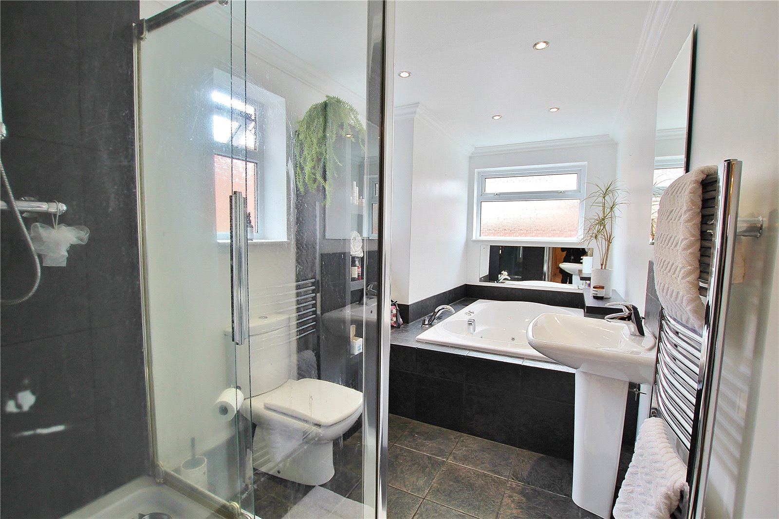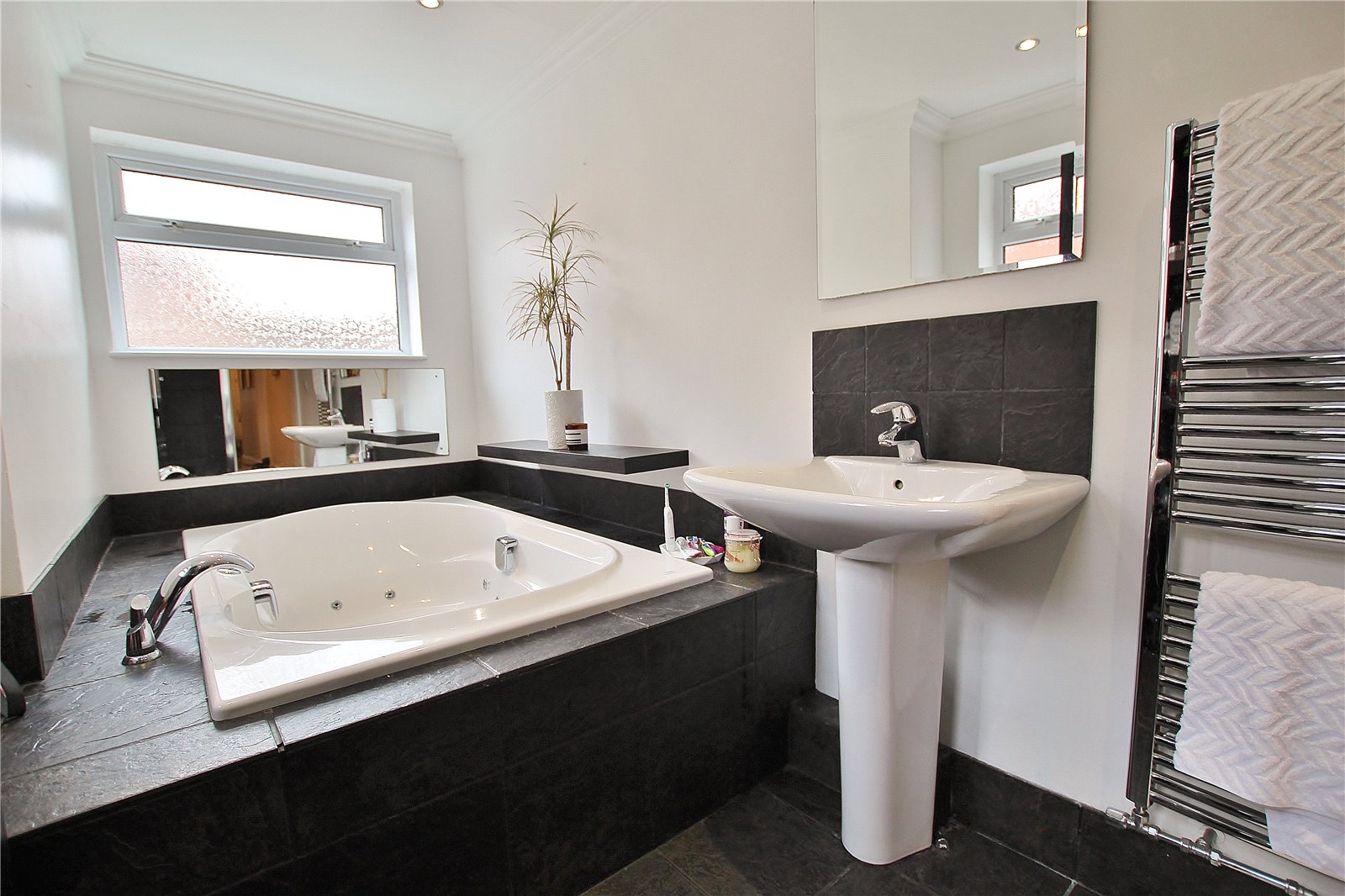 Bathroom Opaque windows to the front and side, a modern white suite comprising of an oversize large Jacuzzi bath inset around ceramic tiling, a large double separate shower with thermostatic shower controls and ceramic wall tiling with glazed sliding shower screen, Roca pedestal wash hand basin with tiled splashback, close coupled push-button WC, black slate effect ceramic floor tiling with matching upstands, heated chrome towel rail, ceiling spotlights.