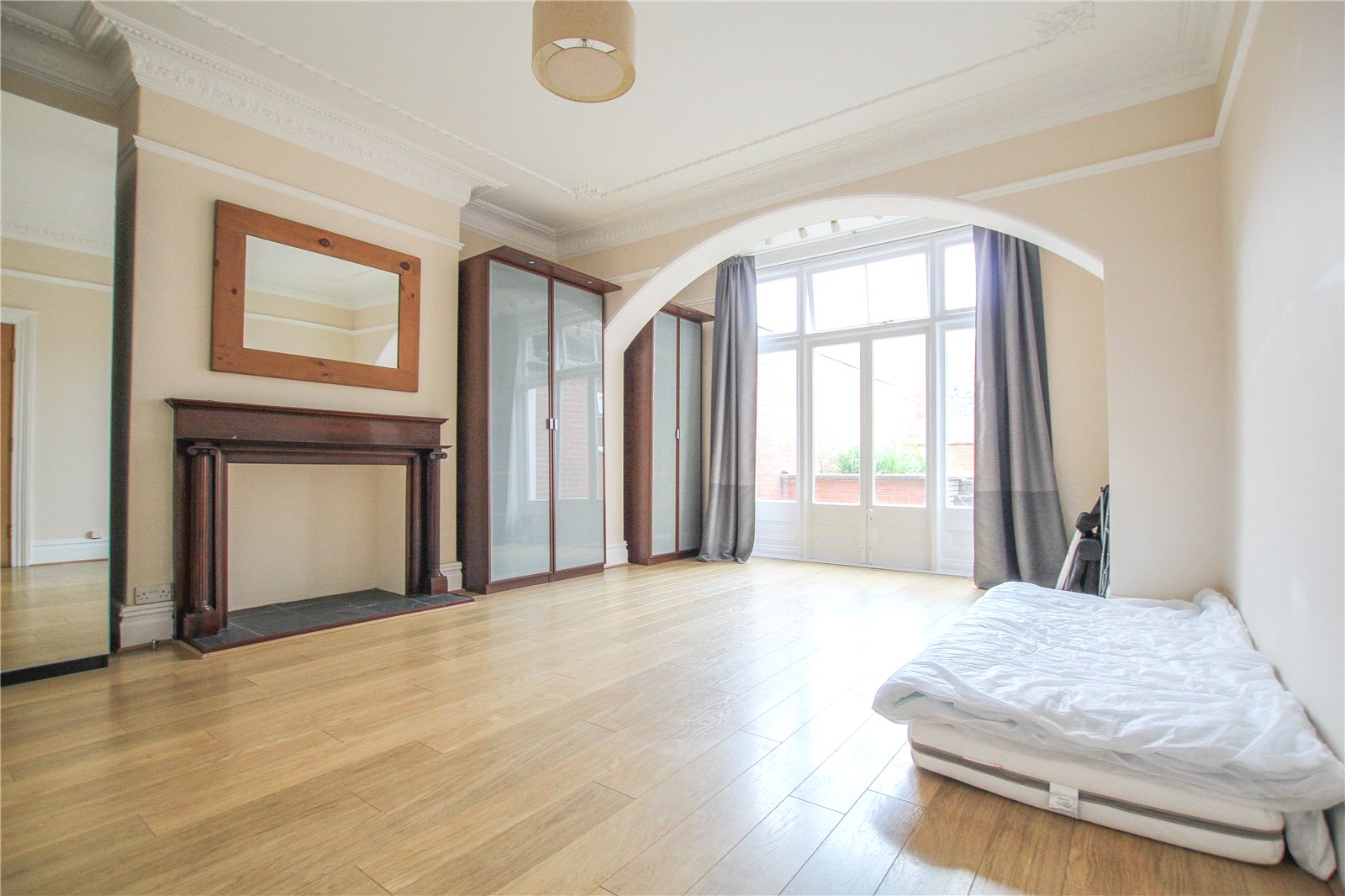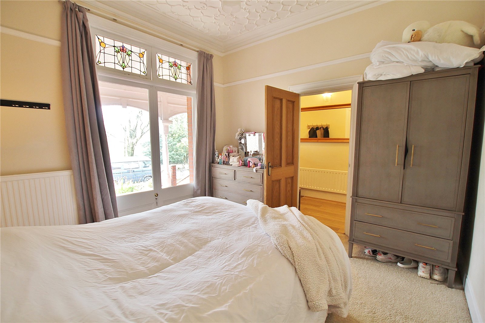 Bedroom 1 19'4" (5.89m) x 14'11" (4.55m) A large and bright principal bedroom with French doors opening onto the rear patio and garden beyond with matching side screens and upper glazing, a feature arch divide, laminate flooring, two radiators, a fireplace with a timber surround and slate hearth (not functioning), ornate ceiling moulds and coving with picture rail and high level moulded skirting boards, telephone point, recesses either side of chimney breast ideal for wardrobe space.