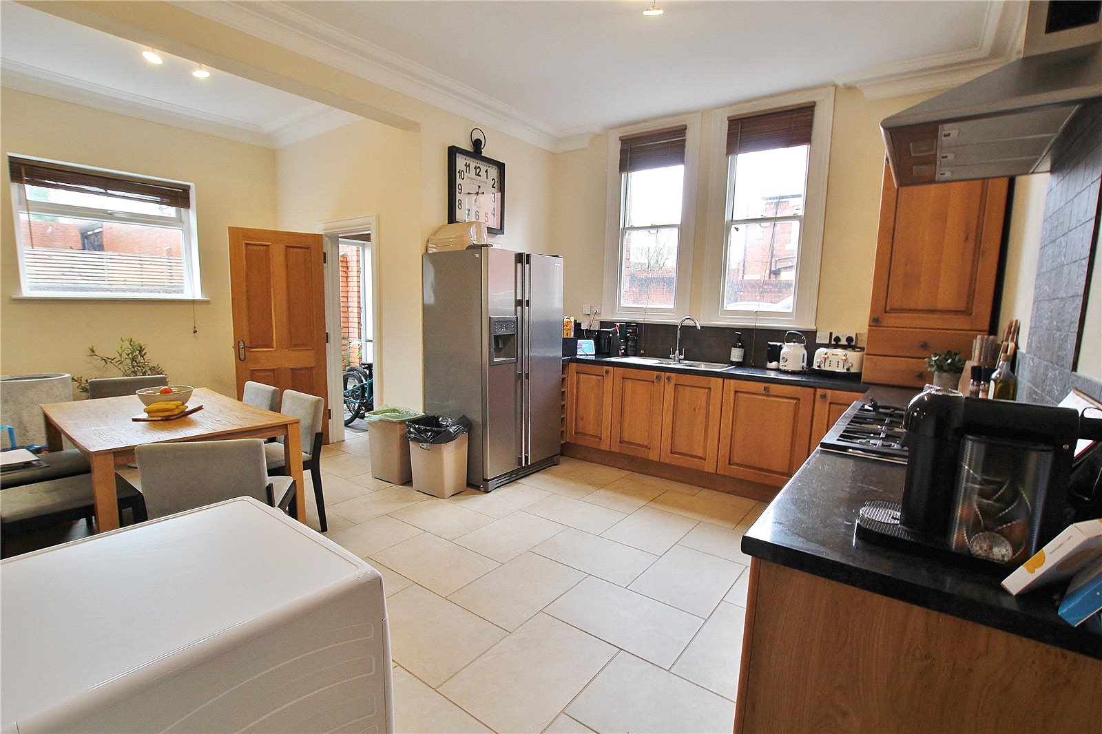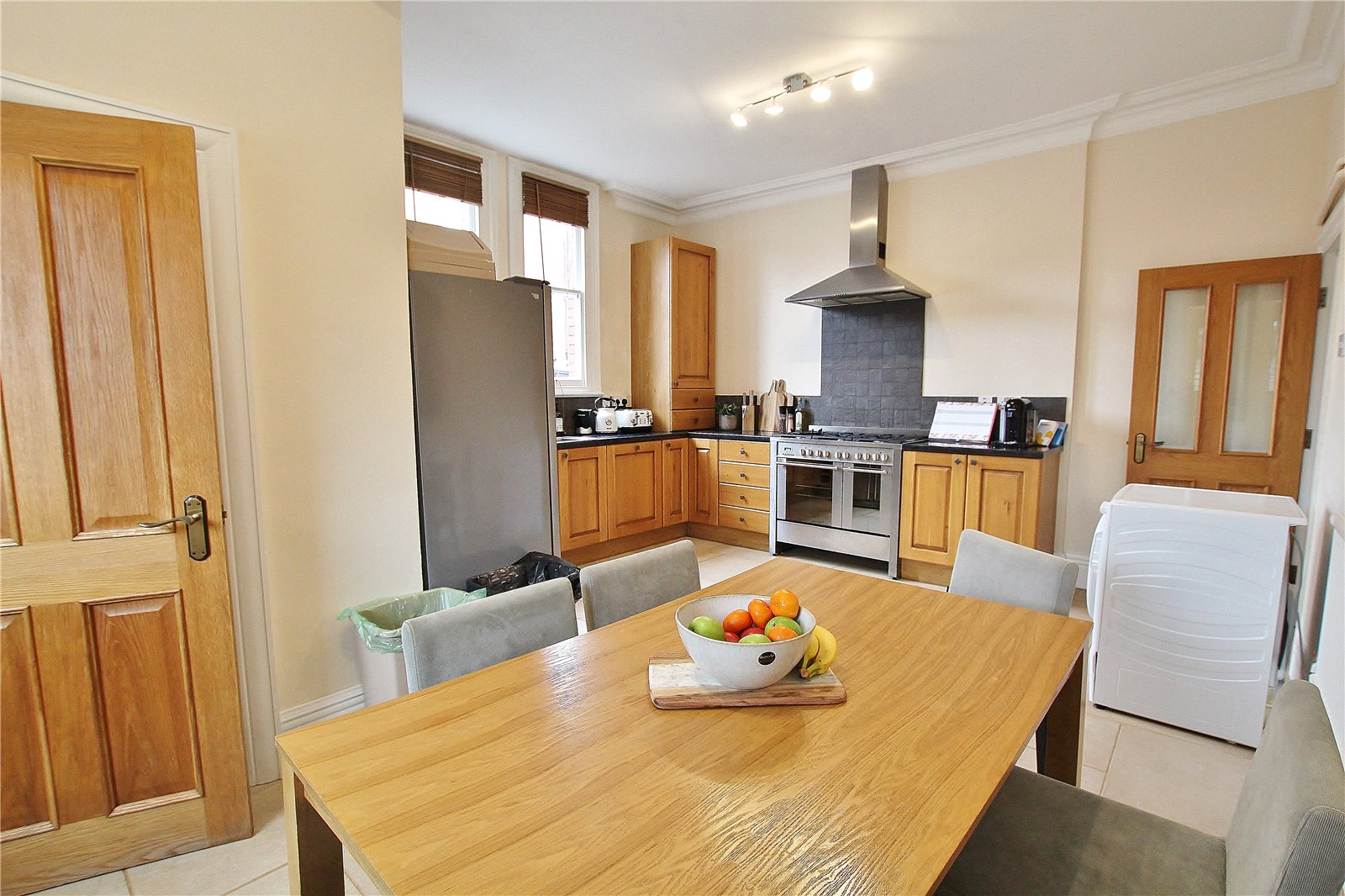 Kitchen/Breakfast Room 18'10" (5.74m) x 14'1" (4.29m) overall Period sash windows to the side, with a uPVC double glazed window overlooking the rear garden, oak fronted kitchen appointed along three sides comprising of base units with drawers and granite style worktop over, wall tiling to work surface surrounds, range style cooker comprising of a six-burner gas hob with two ovens below and grill with a wide cooker hood above, American style fridge/freezer, integrated dishwasher, wall mounted gas central heating boiler concealed behind a matching wall unit, ceramic floor tiling, inset 1.5 bowl sink with mixer tap, telephone and internet point, large radiator, period coved ceilings and high level moulded skirting boards, door to utility room.