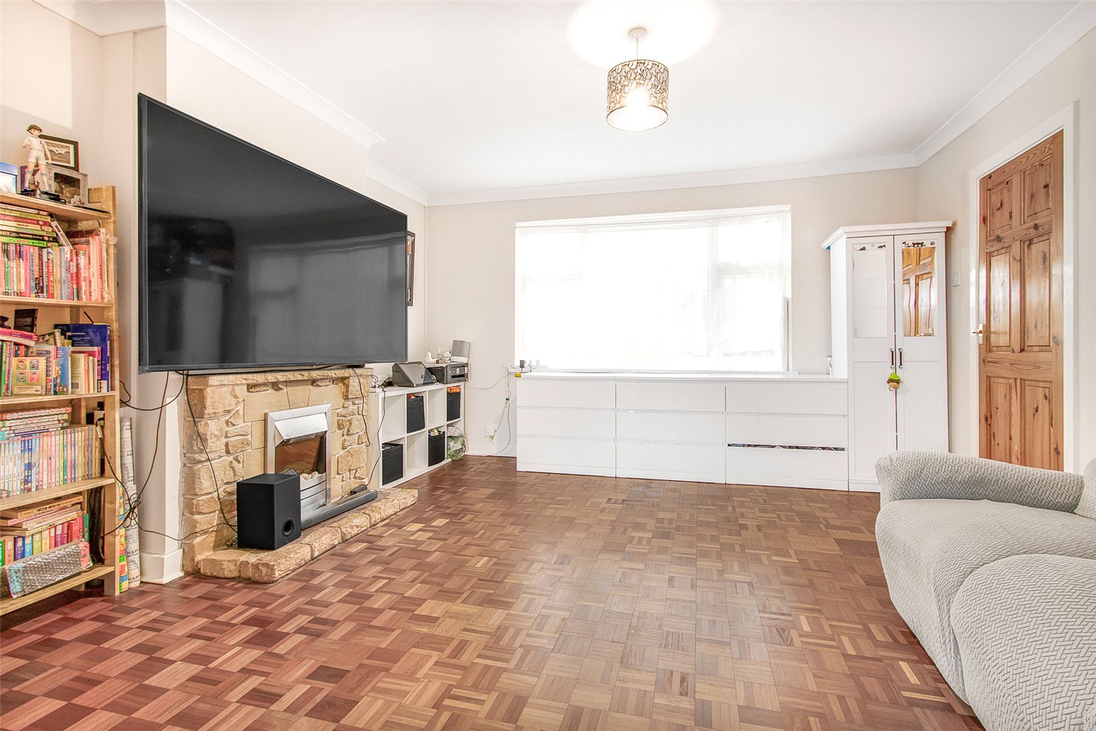 Lounge 13'10" (4.22m) x 13'7" (4.14m) Large window overlooking the lawned front, continuation of the parquet wood flooring,