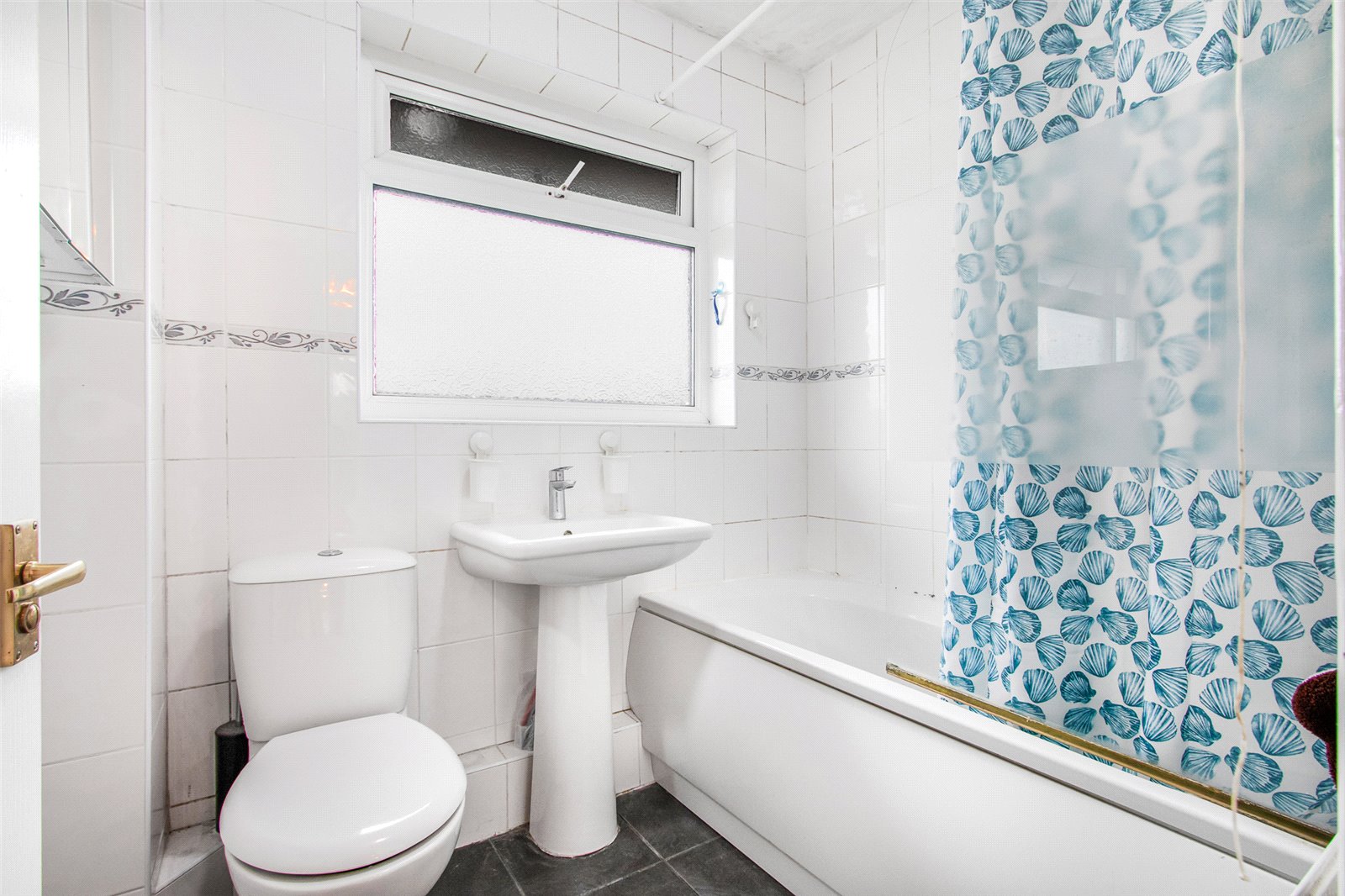 Bathroom White suite comprising low level WC with push button cistern, pedestal wash hand