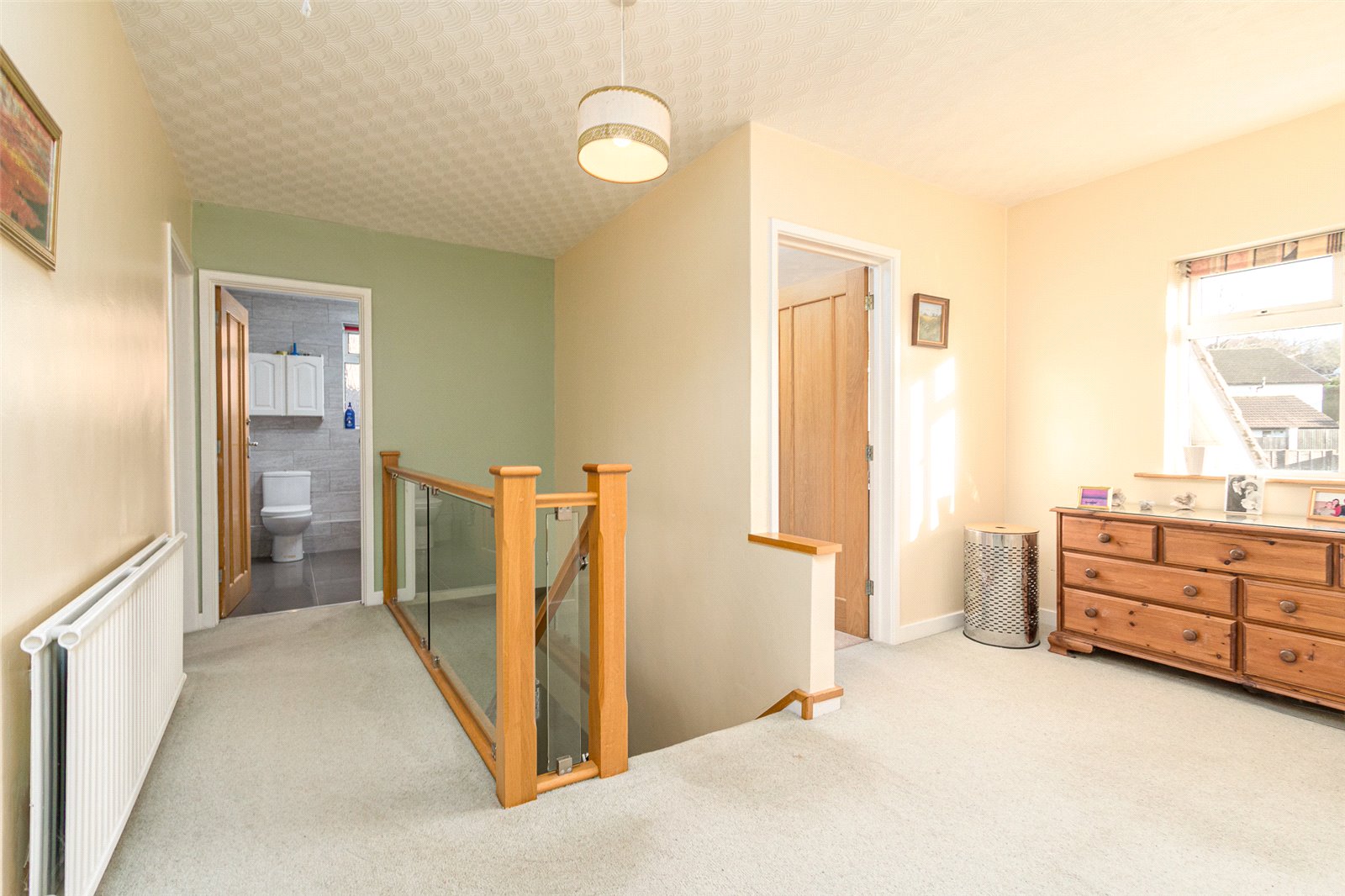 First Floor Landing A large light and central landing overlooking the front driveway and quiet cul-de-sac with ample space for a work station and continuation of the Neville Johnson glass balustrade, double radiator, doors to the first floor accommodation, loft access with pull down loft ladder, a large proportion of boarded floor, lighting.
