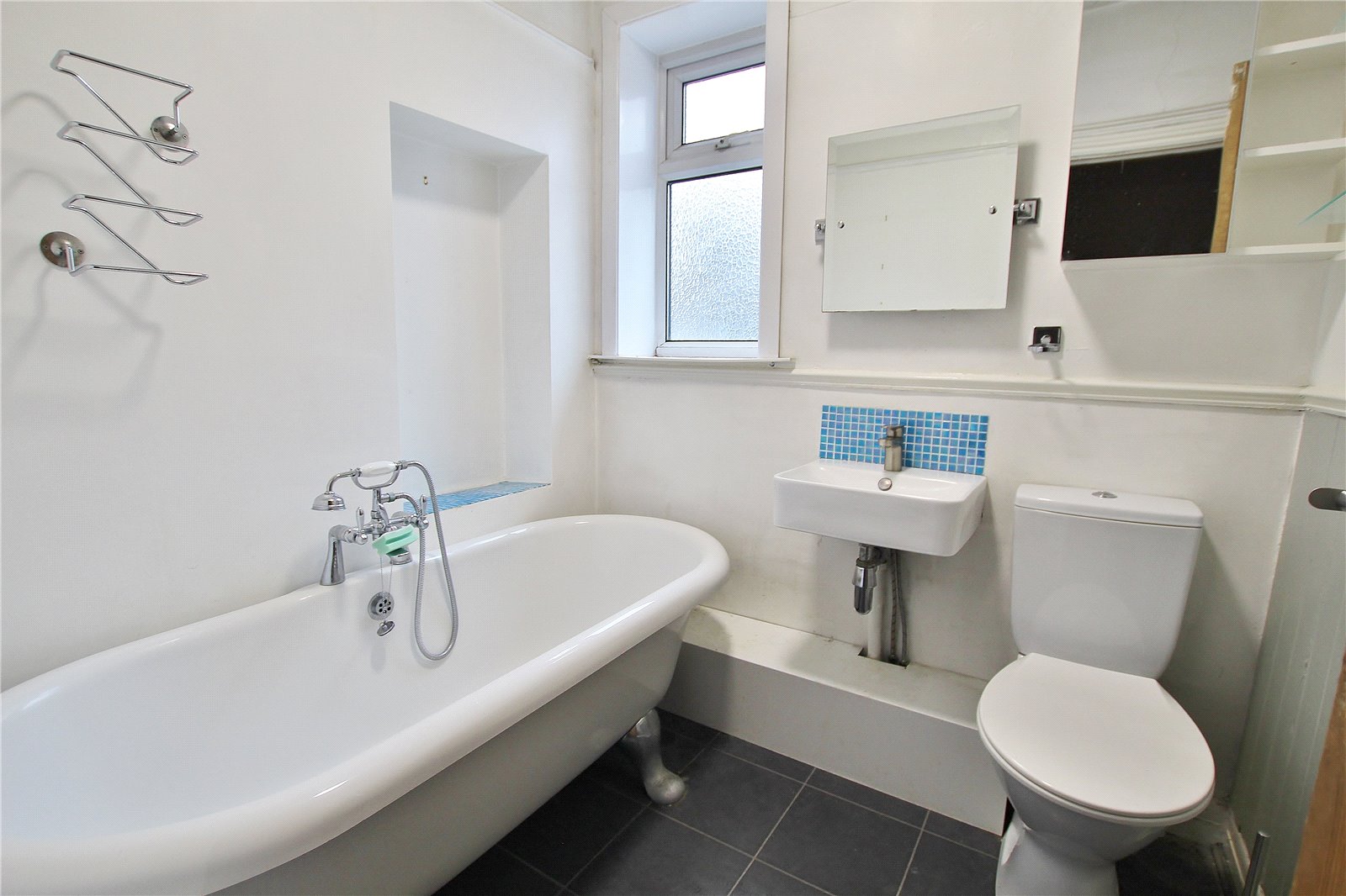 Bathroom Opaque window to the front, small standing roll top bath with telephone style mixer tapes, wall mounted wash hand basin, close couple push button WC, wall panelling to half height on one wall with dado rail and heated chrome towel rail, tile effect laminate flooring, picture rail.