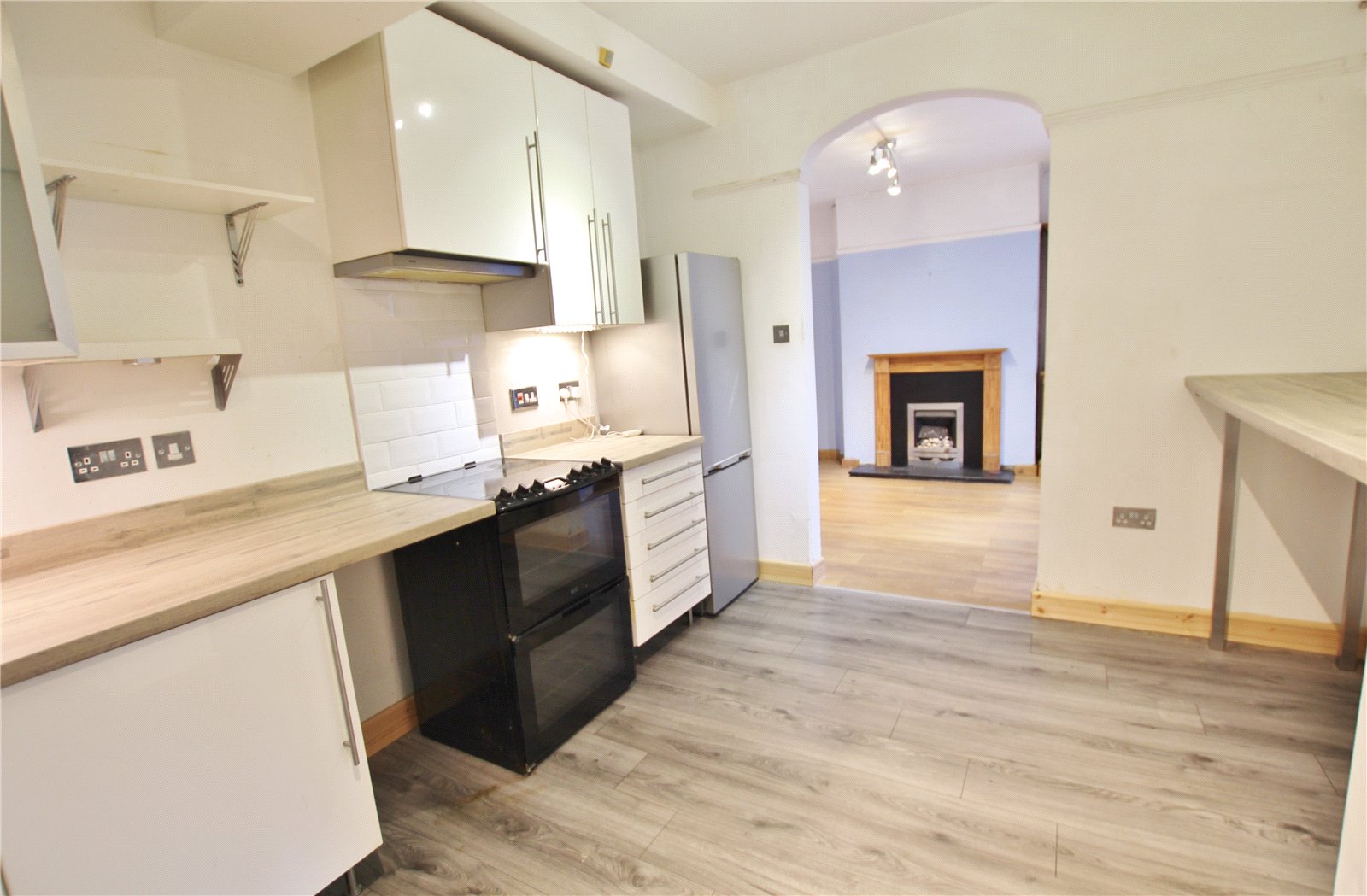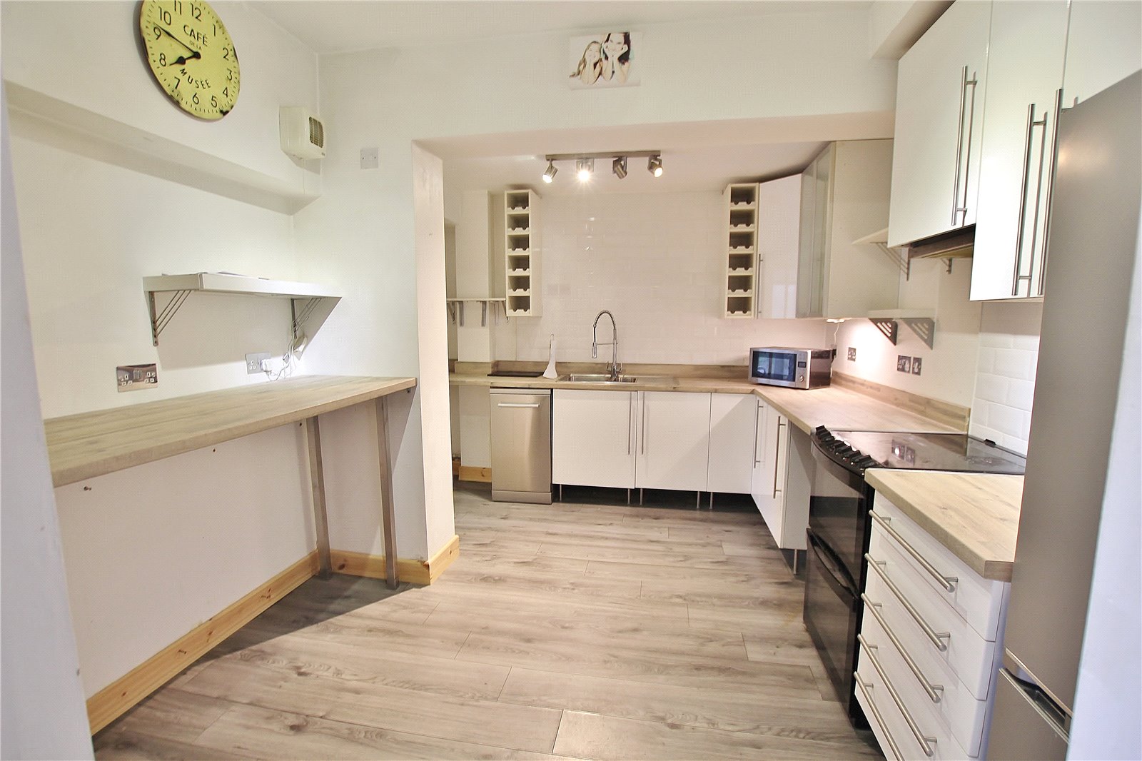 Kitchen 125 x 10 A white gloss finish kitchen appointed along three sides comprising of eye level and base units with drawers and round nose wood effect work tops over with matching upstand. Subway style wall tiling to one wall, inset one and a half bowl sink with drainer and pull out mixer tap. Space for floor standing dishwasher, slot for a cooker, breakfast bar area, space for an upright fridge freezer, laminate flooring, glazed door into the utility.