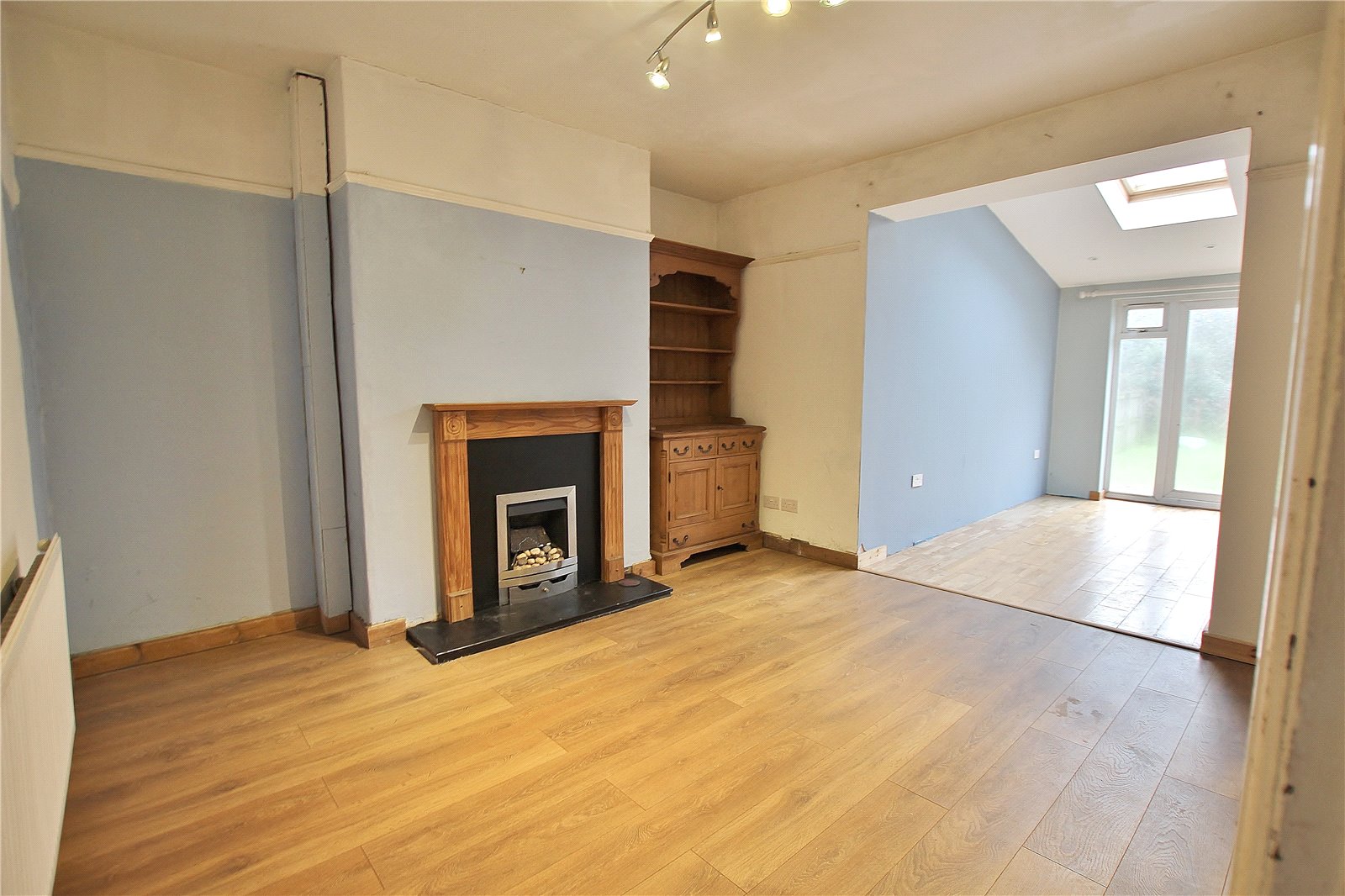 Sitting Room 131 x 122 Feature vaulted ceiling with double glazed velux roof windows, further full height window and French doors opening onto the rear garden, laminate flooring, radiator.