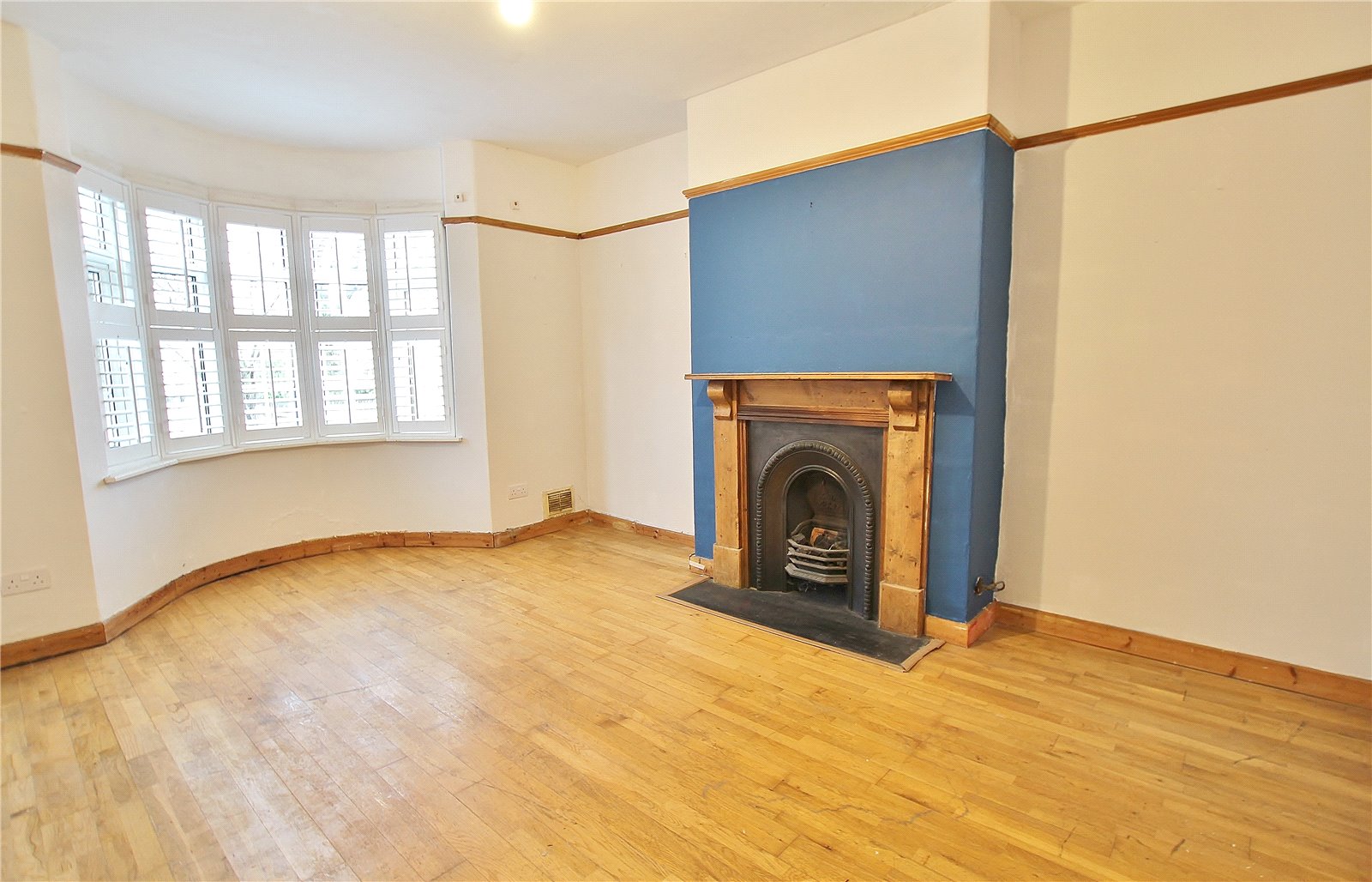 Lounge 16 into bay x 112 Five part curved bay with UPVC double glazed windows with bespoke shutters, radiator, timber fire surround with a grate and black slate hearth, laminate flooring, picture rail.