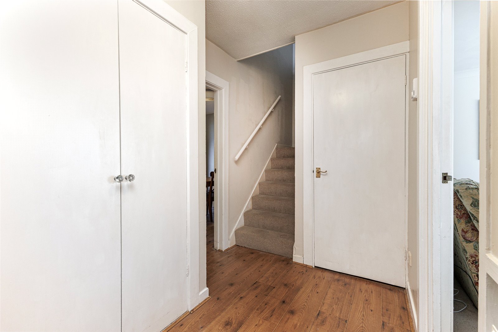 Entrance Hall Continuation of the wood effect laminate flooring, built-in double cupboard with coat hooks and shelving, radiator and a large walk-in under stairs storage cupboard full turning staircase to first floor landing.