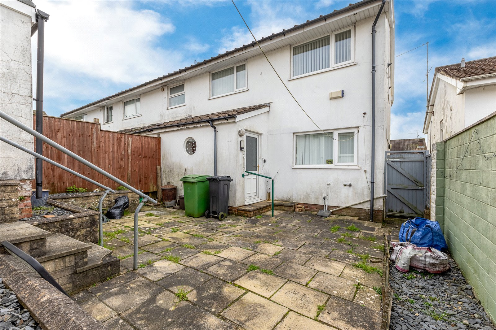 Rear Garden Low maintenance, outside water tap and lighting, path to the rear entrance gate and steps and doors to the double garage.