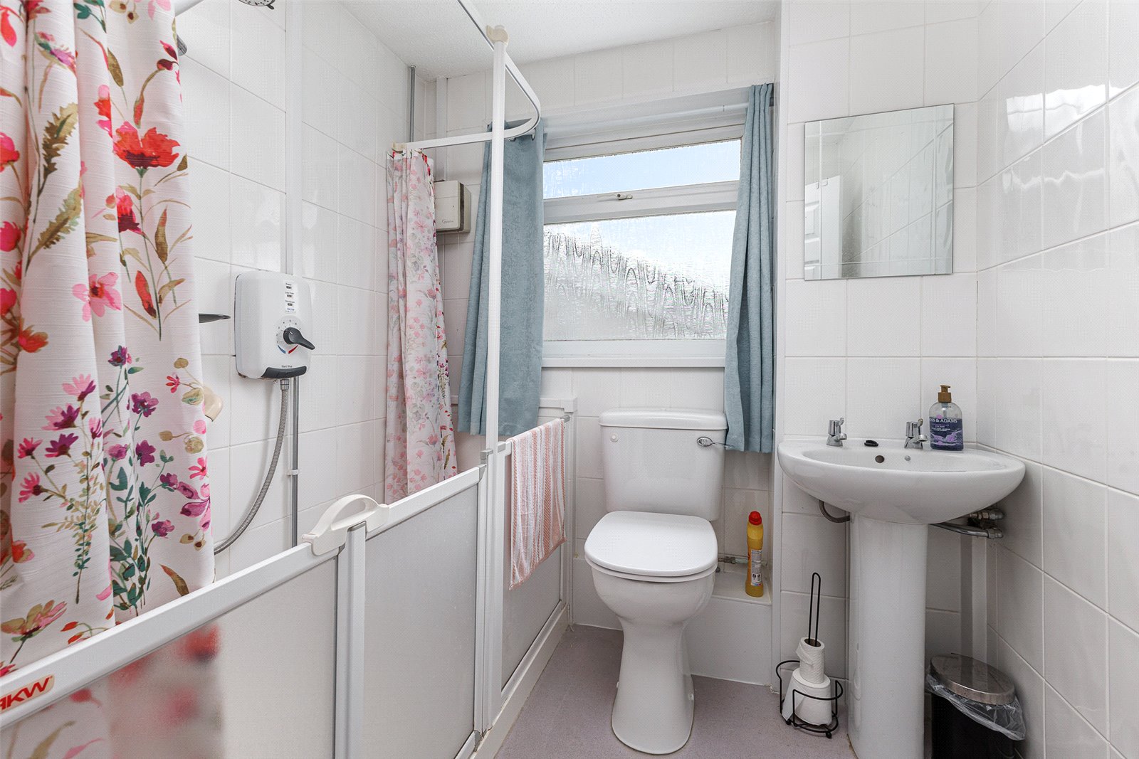 Bathroom A white suite with an adapted walk-in shower area with electric shower over, close coupled WC, pedestal wash hand basin, opaque window to the side, comprehensive ceramic wall tiling and anti-slip flooring.