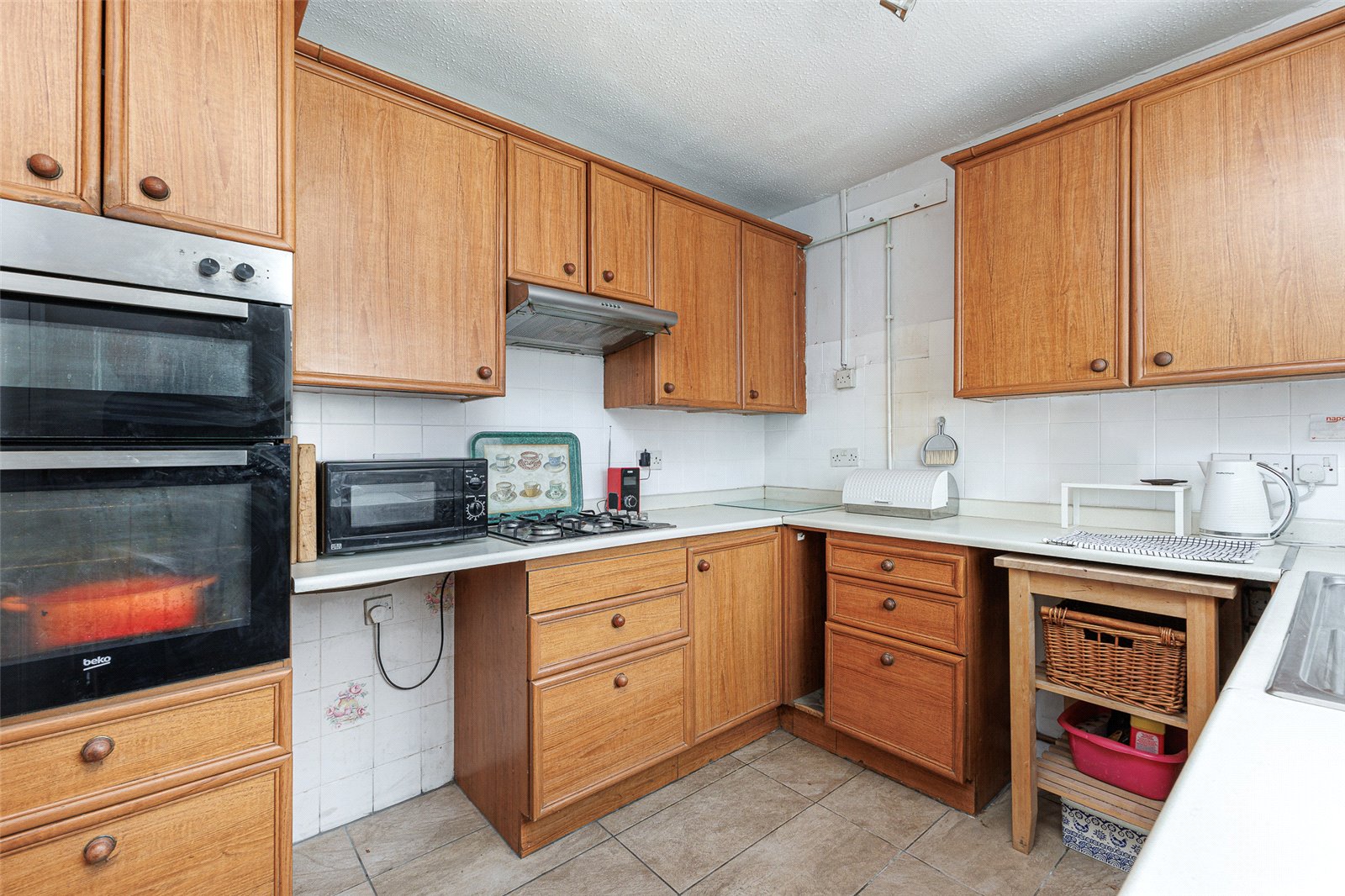 Kitchen 95 x 85 Overlooking the rear garden, basic kitchen units with wood fronts, appointed along three sides comprising of eye level units and base units with drawers and round nose worktops over, ceramic wall tiling to work surfaces surrounds, inset sink with drainer, fitted four burner gas hob with cooker hood above, built-in double oven, plumbing and space for washing machine, further space for an upright fridge freezer, ceramic floor tiling, double radiator.