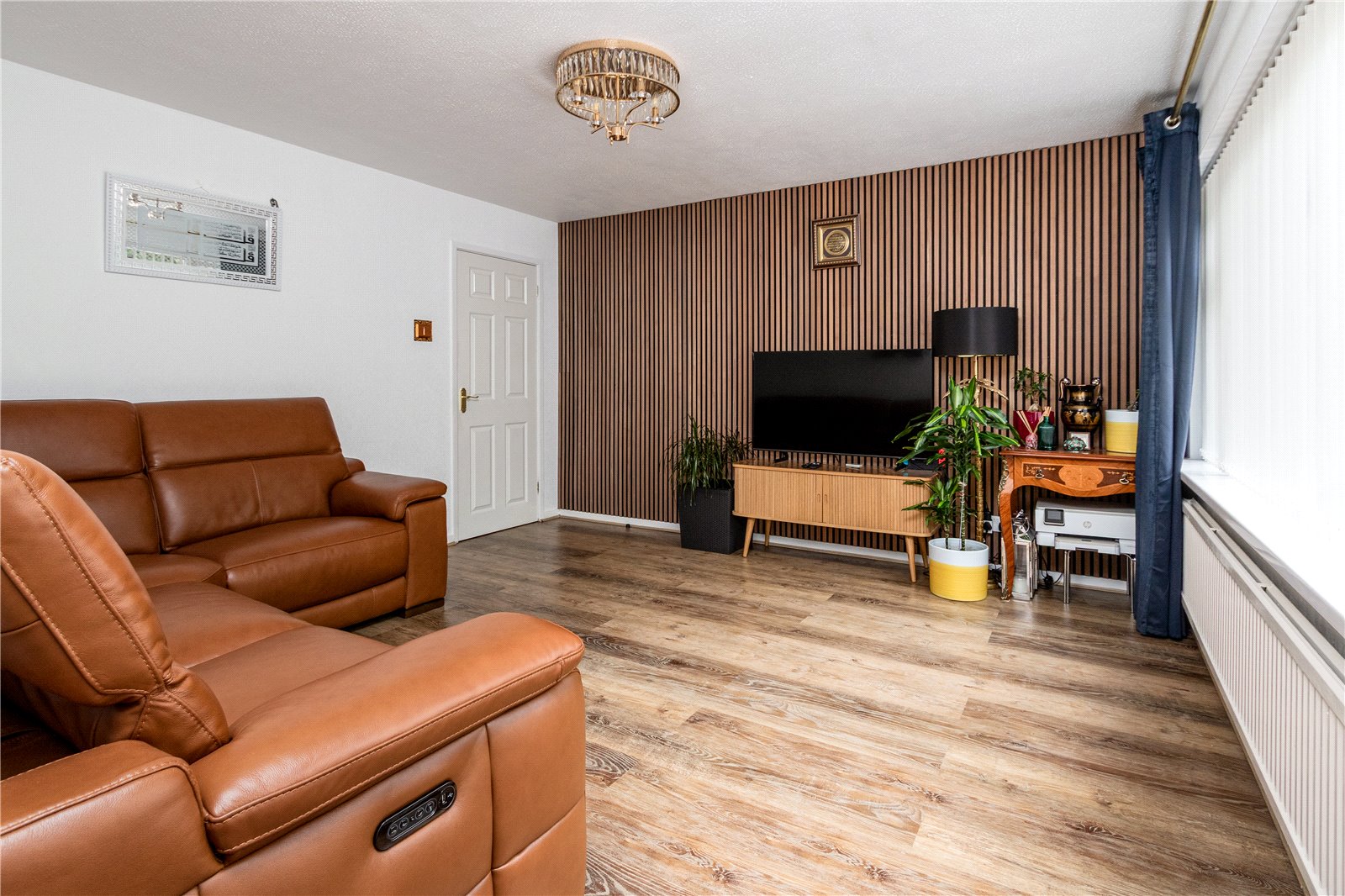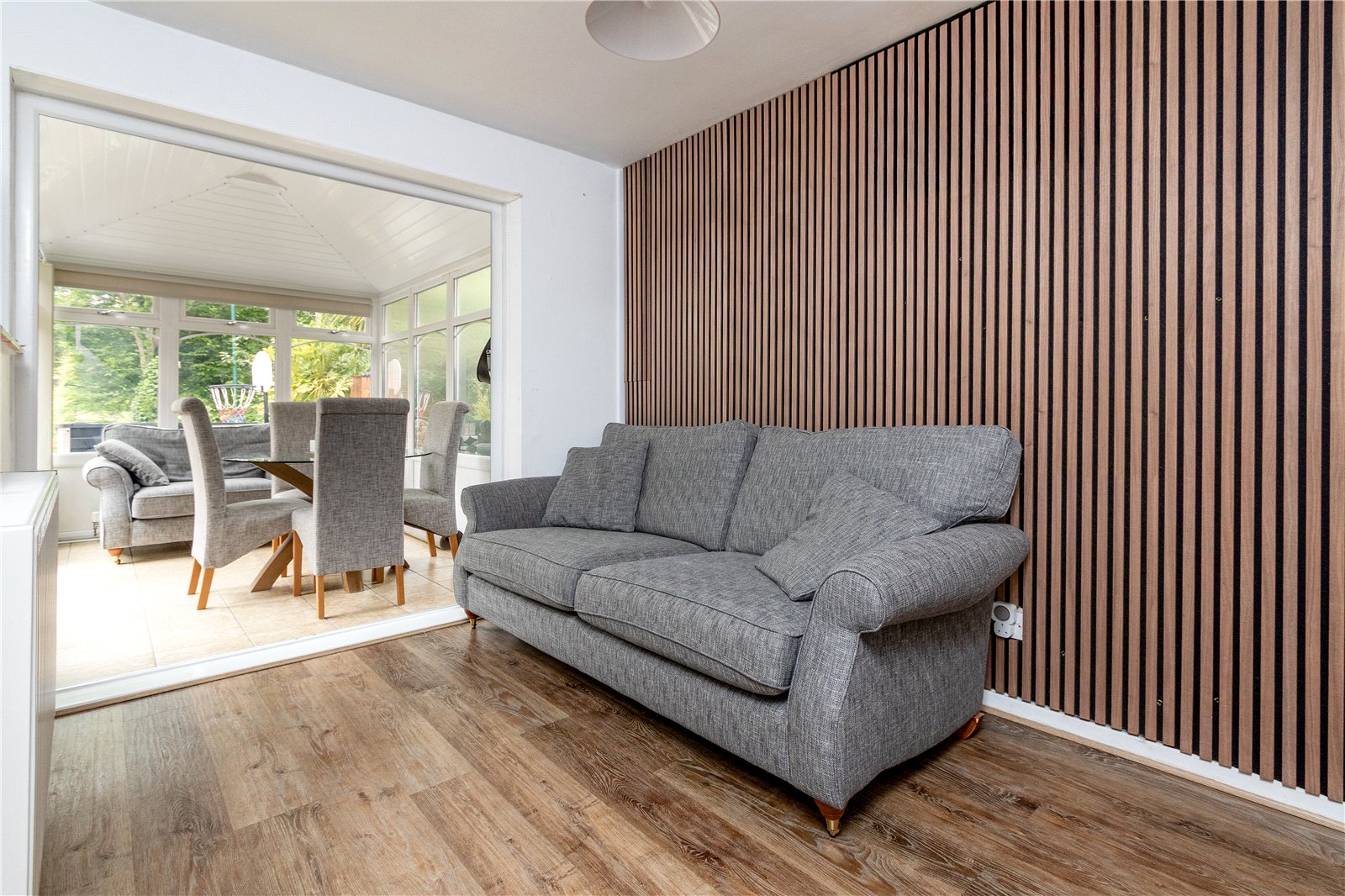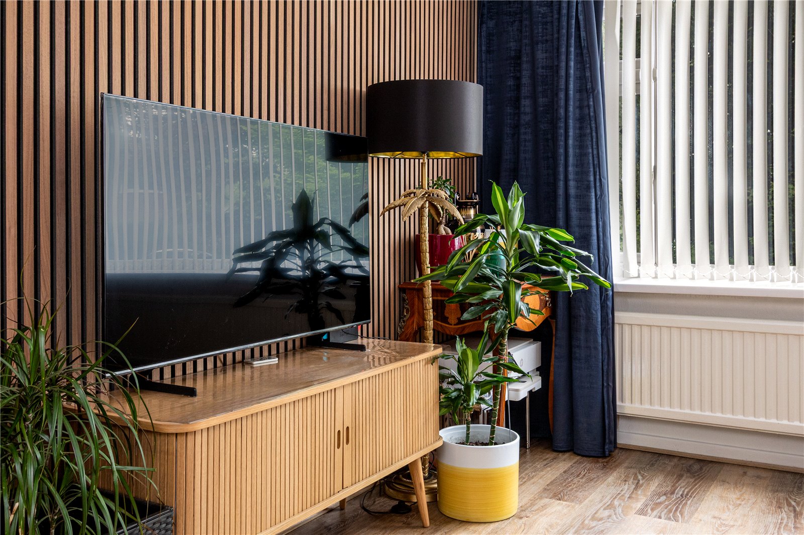 Lounge Overlooking the front drive and quiet end of cul-de-sac, large double radiator, a contemporary acoustic wall with vertical strip timber and sound proofing, quality wood effect flooring, door to kitchen/diner.