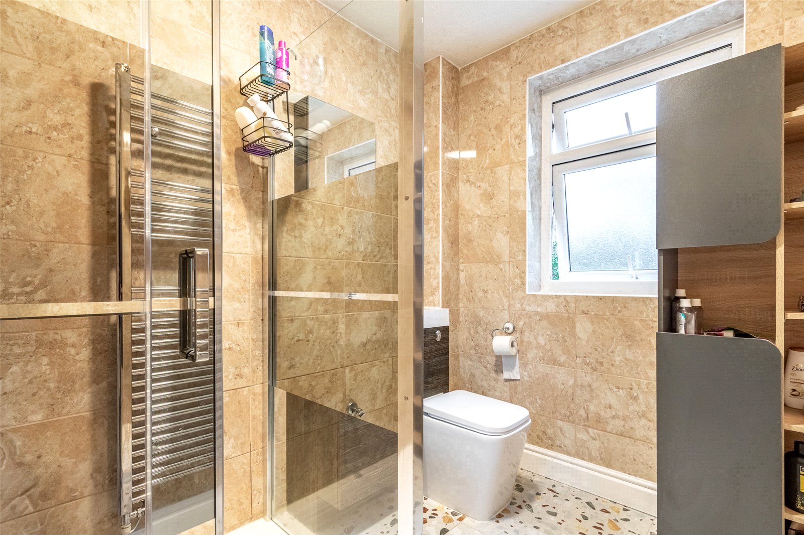 Shower Room Opaque window to the rear, a large double shower with sliding glazed door, fixed rainfall style shower head above and flexible handle with thermostatic controls, comprehensive ceramic wall tiling, close coupled WC, pedestal wash hand basin, heated chrome towel rail, quality wood effect flooring.