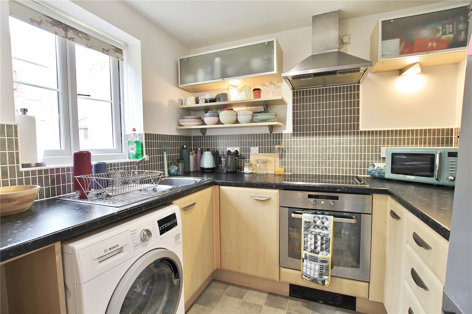 Kitchen    Appointed along three sides in wood grain finish fronts beneath round nosed worktop surfaces, inset 1.5 bowl stainless steel sink with side drainer, mixer tap, inset four ring hob with cooker hood above, integrated oven below, space for fridge/freezer, plumbing for washing machine, eye level storage with lighting below, wall tiling to worktop splashback areas, window overlooking communal gardens, vinyl flooring, low level 'Creda' heater.