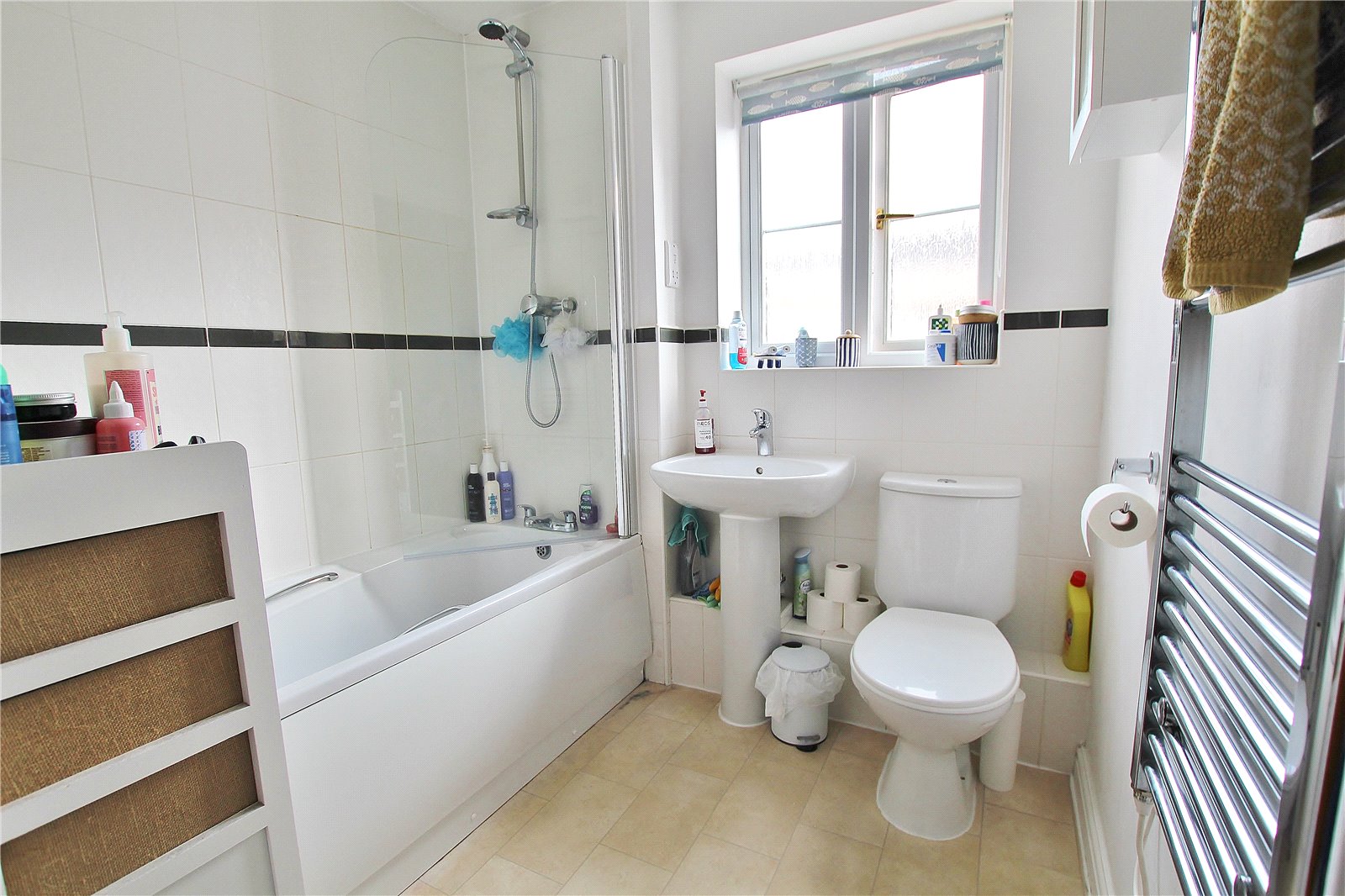 Bathroom    Modern suite comprising low level WC, pedestal wash hand basin, panelled bath with 'Mira' shower, wall tiling to splashback areas, obscure glass window to rear, extractor fan, electric shaver point, vinyl floor covering, chrome heated towel rail.