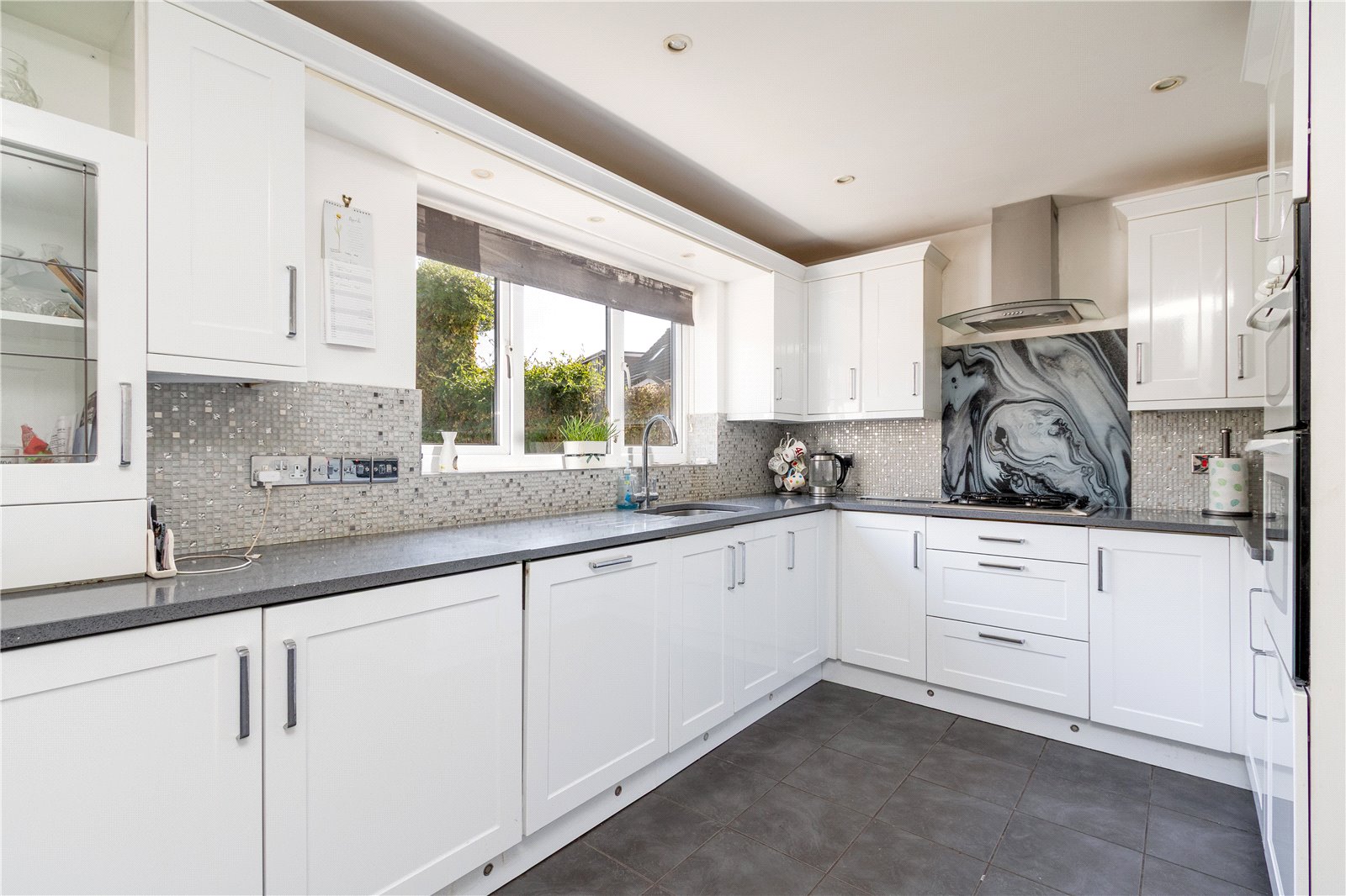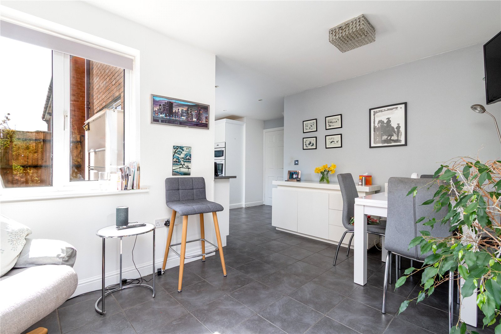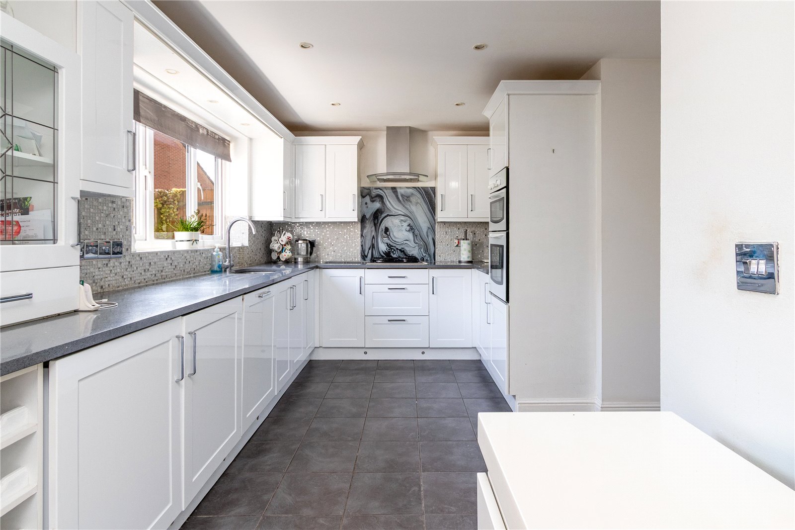 Kitchen/Family Room 22'1" (6.73m) x 18'5" (5.61m) Appointed along three sides in modern white gloss finish fronts beneath quartz worktop surfaces, stainless steel under mounted 1.5 bowl sink with grooved drainer and mixer tap, four ring gas hob with stainless steel and glazed cooker hood, integrated dishwasher, fitted oven and grill, integrated low level fridge and freezer, matching range of eye level units, inset spotlights, mosaic wall tiling to worktop surrounds, tiled flooring, opening to the family area with window to rear and side, uPVC French doors leading onto the rear patio, ample space for breakfast table, two radiators, continuation of the tiled flooring.