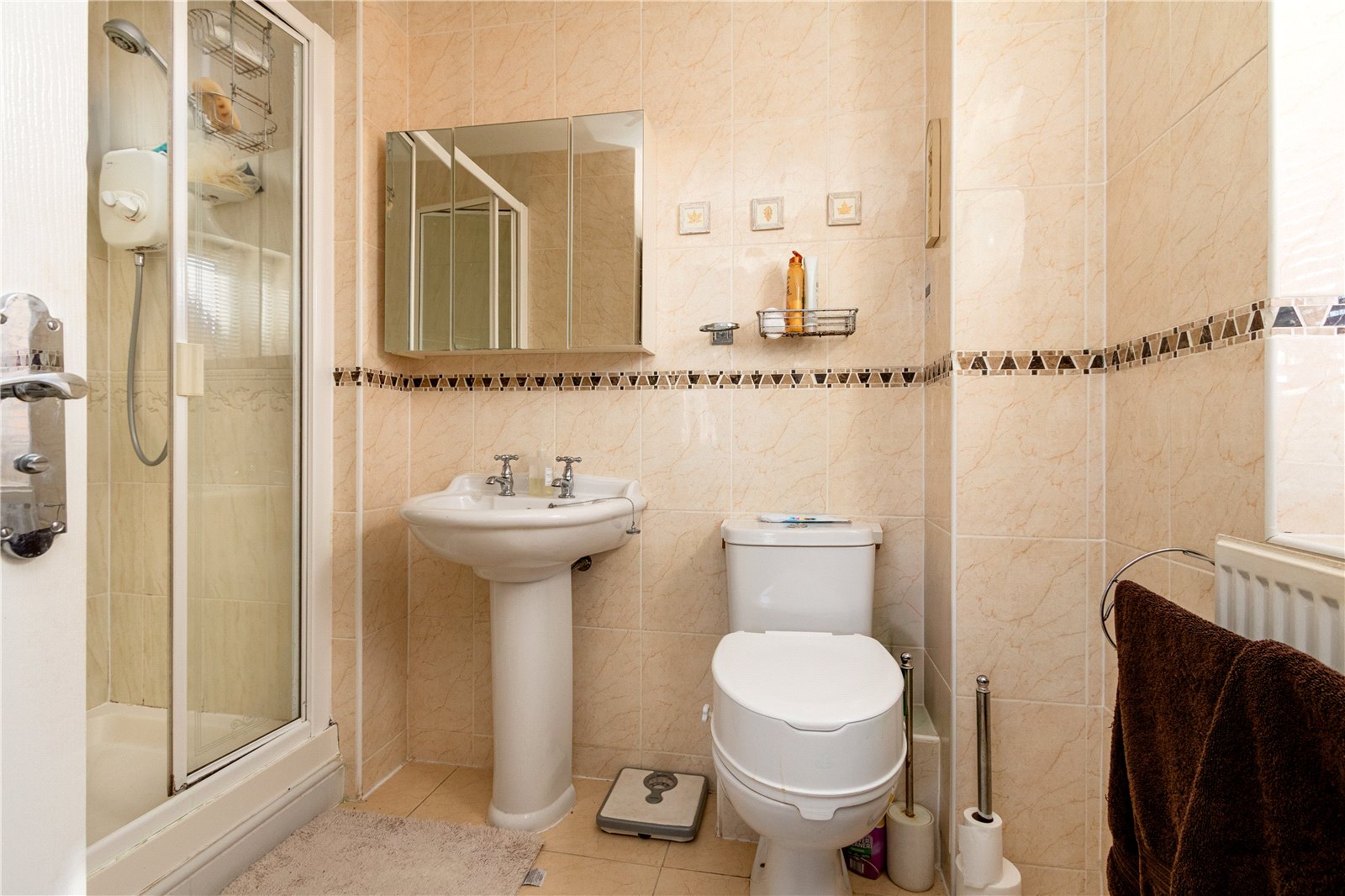 En Suite Low level WC, pedestal wash hand basin, large shower cubicle with folding shower screen and electric shower, comprehensively tiled walls, radiator, tiled flooring, opaque window to side.