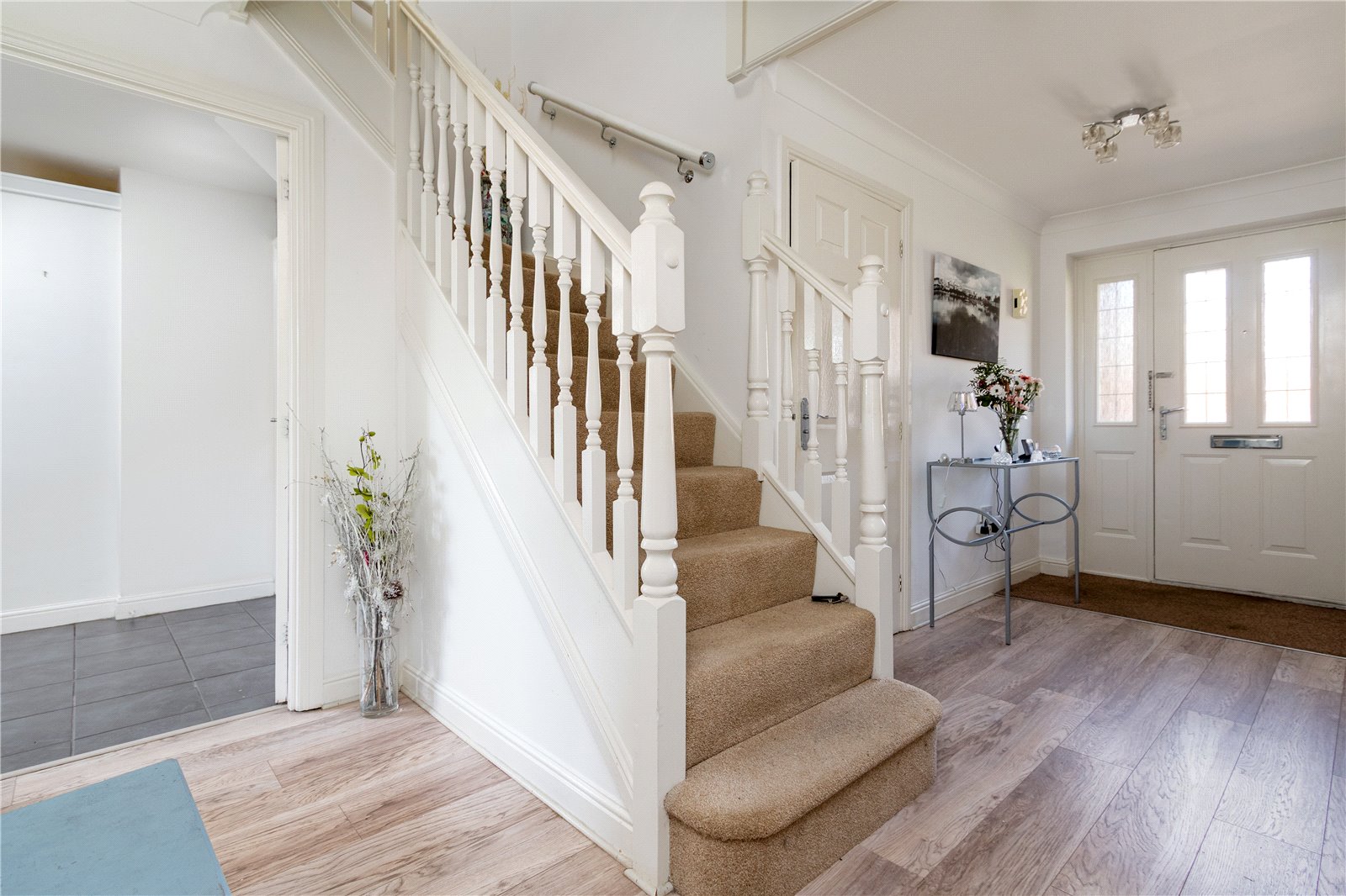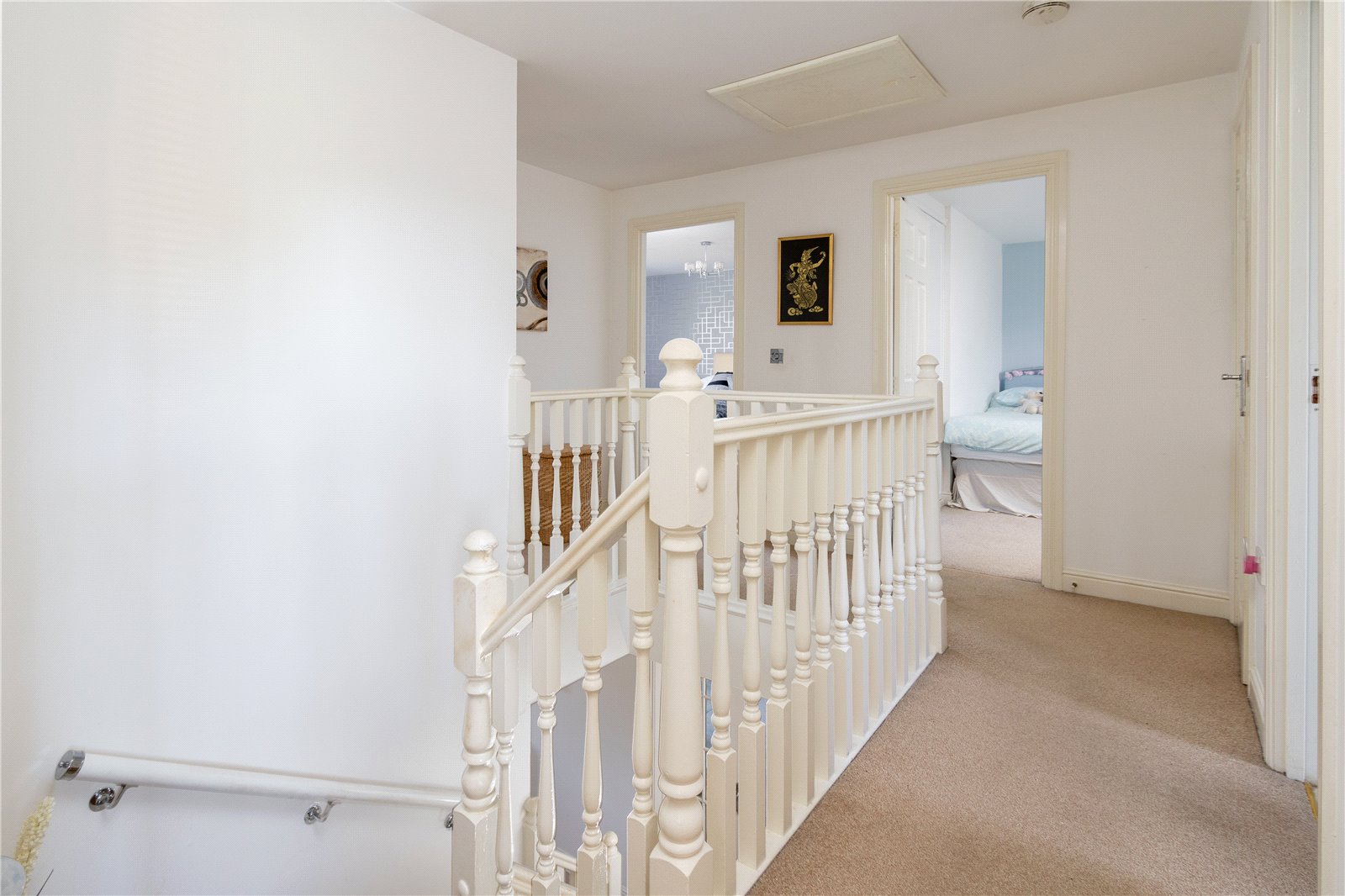 Entrance Hall Approached by an entrance door with opaque glazed panels and matching side panel, leading onto a welcoming central hallway, half turning spindle staircase to a galleried landing, wood grain effect laminate flooring, radiator.