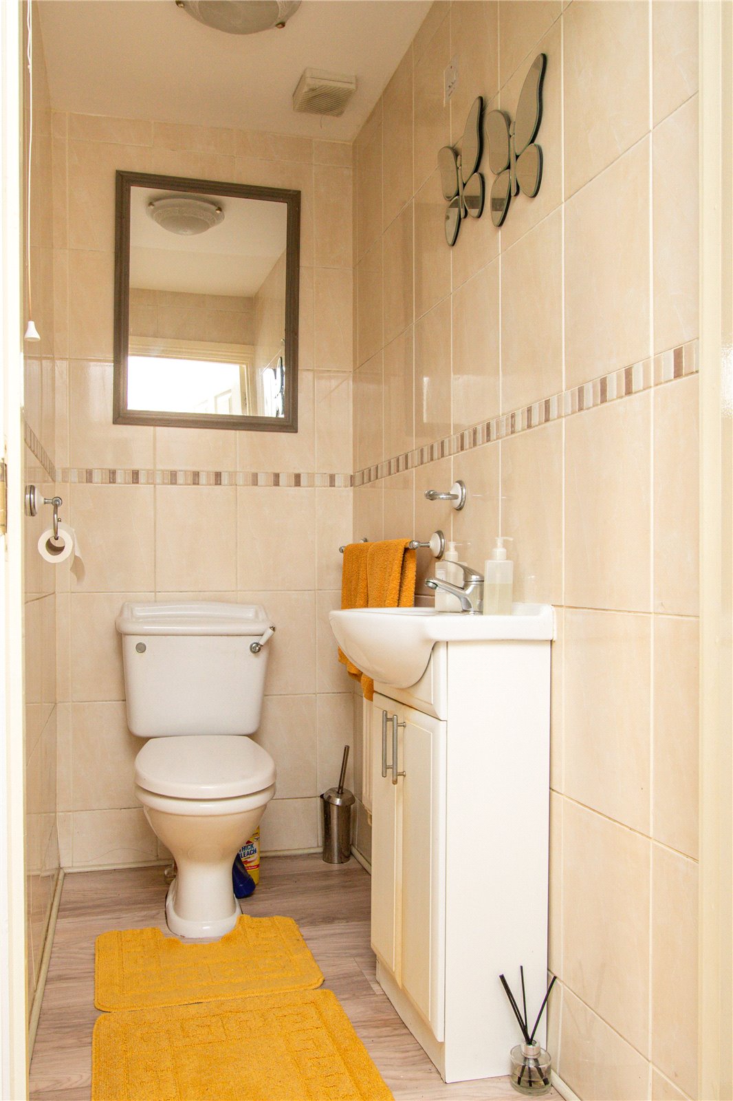 Cloakroom Low level WC, wash hand basin with cabinet below, comprehensively tiled walls, wood grain effect laminate flooring, radiator