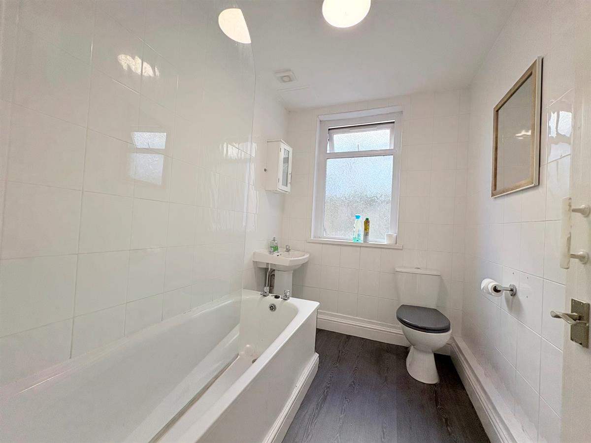 White door with silver handle upon entry, grey laminate flooring, white tiled walls, white skirting boards, extraction fan fitted, one window overlooking rear, white storage cabinet attached to wall, white bath with silver taps and silver shower head unit, white sink with silver taps, white toilet with grey lid and seat.