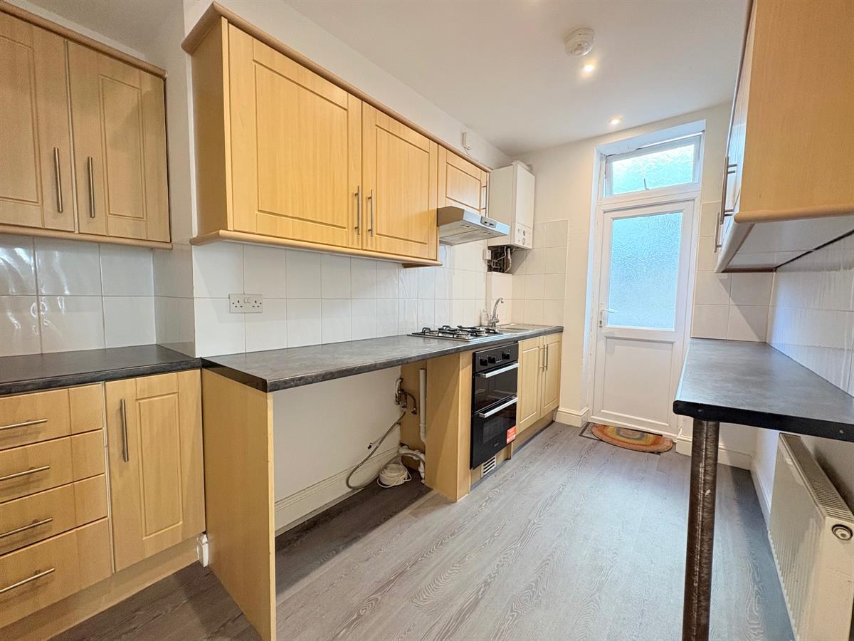 White door with silver handle upon entry, grey laminate flooring, white walls, white tiling around worktops and appliances, white skirting boards, black worktops, wood cabinets, silver sink with silver taps, silver hob and extraction hood, one window overlooking rear, white door upon exit to rear, three visible dual plug sockets, one white radiator.